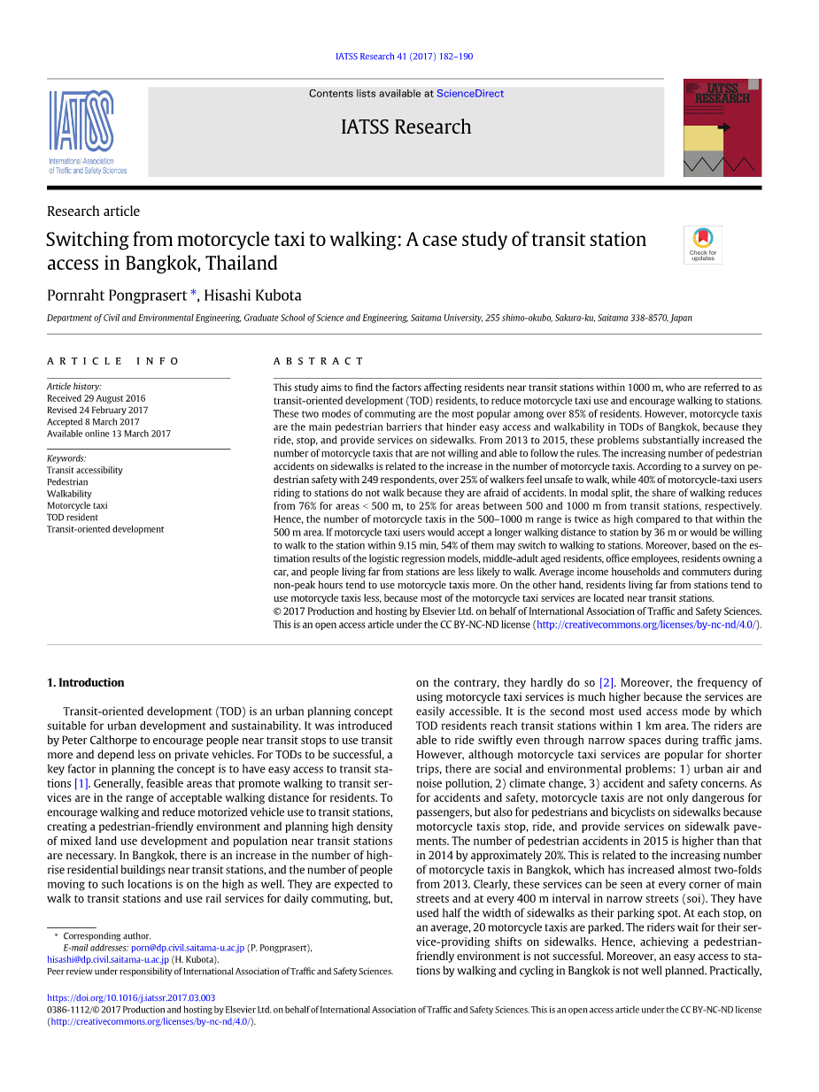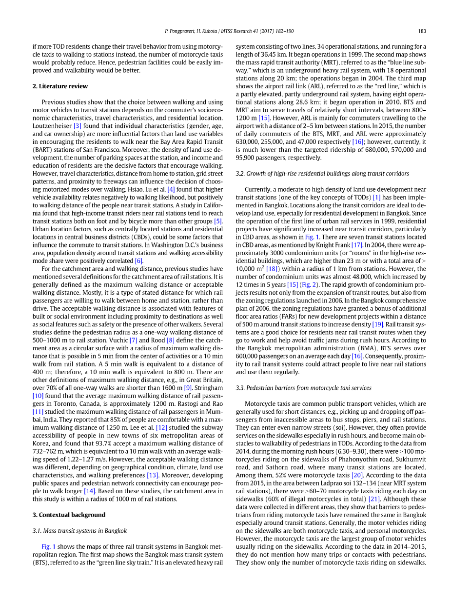 公交导向发展(TOD)是一种适合城市发展和可持续发展的城市规划概念。它是由Peter Calthorpe引入的,旨在鼓励交通站附近的人们更多地使用公交车,并减少对私人车辆的依赖。为了使TOD成功,规划概念的关键因素是可以轻松访问中转站[1].通常,促进步行到交通服务的可行区域在居民可接受的步行距离范围内。为了鼓励步行并减少机动车辆使用到中转站,建立一个适合行人的环境和规划高密度的混合土地利用开发和公交站点附近的人口是必要的。在曼谷,公交站附近的高层住宅楼数量有所增加,搬迁到这些地点的人数也在增加。预计他们将步行到中转站并使用铁路服务进行日常通勤;相反,他们很难这样做[2].此外,使用摩托车出租车服务的频率要高得多,因为服务很容易获得。它是TOD居民在1公里范围内到达中转站的第二大使用接入模式。在交通拥堵期间,车手甚至可以在狭窄的空间内快速骑行。然而,虽然摩托车出租车服务在短途旅行中很受欢迎,但存在社会和环境问题:1)城市空气和噪音污染,2)气候变化,3)事故和安全问题。至于事故和安全,摩托车出租车不仅对乘客有危险,而且对于人行道上的行人和骑自行车者也是危险的,因为摩托车出租车在人行道上停下来,骑车并提供服务。2015年的行人事故数量比2014年高出约20%。这与曼谷越来越多的摩托车出租车相关,从2013年起增加了近两倍。显然,这些服务可以在主要街道的每个角落看到,在狭窄的街道每隔400米就可以看到。他们使用一半宽度的人行道作为他们的停车位。在每个站点,平均停放20辆摩托车出租车。车手等待他们在人行道上提供服务的班次。因此,实现行人友好的环境并不成功。此外,在曼谷步行和骑自行车也很容易进入车站。如果更多的TOD居民改变他们的旅行行为,从使用摩托车出租车改为步行到车站,摩托车出租车的数量可能会减少。因此,行人设施可以很容易地改善,步行性会更好。