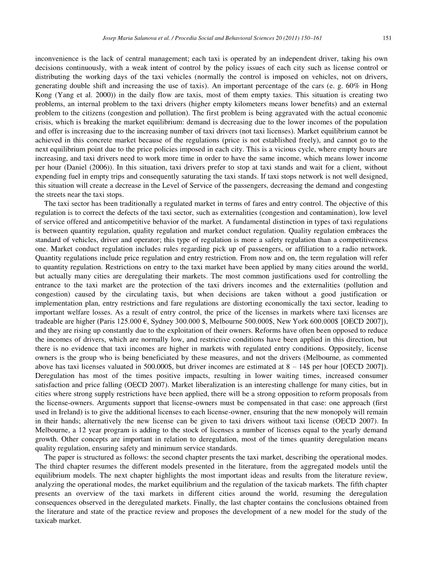 Douglas(1972)是与出租车部门有关的第一批研究的前身。他认为出租车市场是可以在城市街道的任何地方乘坐出租车,并安排(由监管机构)收费和免费入境。他的结论是,该行业的最大收入出现在不是最大需求时,社会福利被描述为一种有效但不可行的(赤字)均衡。他亦证明,在考虑社会福利的情况下,出租车服务时数最大化及需求最大的点是相同的。道格拉斯(1975)提出的公式被后来的所有作者用作参考公式。de Vany(1975)为不同类型的市场提出了解决办法:垄断市场(有进入和票价管制)、竞争性市场(自由进入和受管制的票价)和Medallion市场。在垄断解决方案中,De Vany(1975)提出的公司计划是最大限度地实现总收益,而在竞争解决方案中,所有者的目标是最大化自己的利益。他证明,在零利润约束下,需求是最大化的。他同意Douglas(1972)的观点,即按有效价格将产量降到最低,并注意到受管制的价格将更有可能在竞争而不是垄断。Beesley(1973)和Beesley和Glaister(1983)也研究了这些不同的市场及其特征,试图通过模拟出租车市场相关推论的模型为决策者制定指导方针。他指出并分析了监管的重要因素和缺陷(垄断权、进入条件和票价控制),介绍了外部成本(出租车造成的拥堵),并在从伦敦、利物浦、曼彻斯特和伯明翰获得的出租车数据中验证了他的想法。他的结论是,大于1的弹性只有在受监管的市场上才有可能,因此自由市场的弹性低于1(正如deVany(1975)所假定的)。Manski和Wright(1976)的结论是,在一定范围内,增加许可证数量将减少预期等待时间,提高预期利用率。Schroeter(1983)在一个受管制的市场上建立了一个理论模型,其中无线电调度和机场出租车站是主要的运营模式,他还将他的方法应用于明尼阿波利斯出租车部门。Daganzo(1978)是第一个把旅行时间和等待时间作为物理变量来研究的。他利用德利特尔提出的排队理论研究了出租车的最优规模。这一最低限度的车队确保在所需区域结束时的最低服务水平(更大的等待时间是不可接受的)。Foerster和Gilbert(1979)在涉及不同价格、进入政策和行业集中度因素类型的八种监管情景框架内研究了监管的效果。他们指出:在一个无组织的行业中,价格不会受到市场的管制,它会在没有任何抵消压力的情况下上升,降低利用率;如果价格固定,垄断将产生比竞争性产业生产水平更低的产出水平(如de Vany(1975)所得出的结论);进入控制具有相同的效果,在两种类型的行业中都会增加价格。他们就其工作提出了不同的公共政策指导方针,并建议需要经验数据来记录和证明监管影响。凯恩斯和李斯顿-海耶斯(1996)分析了垄断市场,社会最优(最大化的社会和工业利益之和)和第二最佳(非负利润)。他们观察到,当出租车以最佳强度使用时,利润为零。研究表明,在一个简单的出租车服务模式中,价格管制是产生均衡的必要条件,但只有控制出租车的车费和使用强度,才能实现第二优,并得出结论认为,要达到第二好,就需要进行管制。Arnott(1996)对出租车的影子成本进行了第一次最佳分析,并提出了在空置巡游中支付这些费用的补贴。他建立了一个结构模型,考虑到在一个空间上均匀的二维城市上的统一的客户需求分布,以及一个调度中心的供应。他总结说,补贴是必要的,并以社会最优权力下放为条件。他指出,影子成本只有在出租车繁忙时才能支付。Chang和Huang(2003)拓展了Douglas(1972)对空置率和票价优化的研究。Chang和Chu(2009)继续了Chang和Huang(2003)的工作,他们使用了一个具有福利最大化目标的更为广义的模型,以避免弹性约束。他们的模型可以分析和优化最佳环境下的空置率和票价下降。Daniel(2003)建立了一个出租车市场的模型,其中的车费和入口受到管制,并使用夏勒(2007年)获得的数据对其进行测试。他发现空置出租车与需求之间存在着非弹性的关系。他根据服务的价格和空置出租车的数量使用需求函数。费尔南德斯等人(2006)研究了巡航出租车市场的特点,证明了放松管制的市场存在唯一的均衡,它对应于垄断均衡。他们的结论是,进入条例与票价条例是多余的,这会造成更差的行业条件。他们注意到,在存在许多小型经营者的情况下,如果服务供应分散,规模收益就不可能像凯恩斯和利斯顿-海耶斯(1996年)和阿诺特(1996年)所假设的那样,在没有补贴的情况下获得社会最优。他们的结论是,监管需要逐案仔细考虑,因为第二好的自由市场均衡与不受管制的自由市场均衡之间的差异取决于所研究的具体情况。Massow和Canbolat(2010年)开发了一个模型,用于模拟调度市场中出租车的行为,在调度市场中,出租车被分配到每个区域产生的虚拟队列中,而且和在高需求点时相同。他们得出的结论是,出租车将在区域之间的边界等待,并提议建立超级区域,以提高对客户的服务水平。