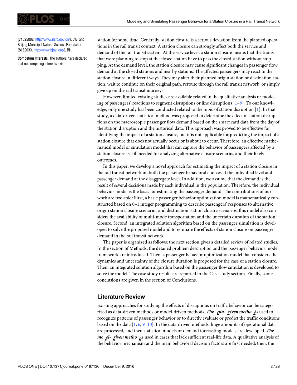 但是,在现有的研究中可用于定性分析,并通过模型显示乘客对分段中断或线路中断的反应[1~8]的,据我们所知,只有一项与车站中断相关 [1]。在该研究中,提出了一种数据驱动的统计方法,用于根据车站中断当天的公交卡数据和历史数据,确定车站中断对宏观客流需求的影响。事实证明,这种方法对于评价车站关闭的影响是有效的,但它不适用于预测极少出现或即将发生的车站关闭的影响。因此,仍然需要一个有效的数学模型或模拟模型来评价受车站关闭影响的乘客的行为,以分析其他封闭情景及其可能的结果。