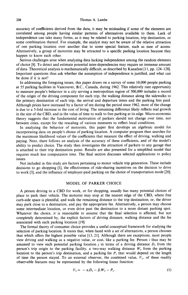 为了解决上述问题,本文在对1962年加拿大温哥华55个停车场约10000人的停车情况进行了调查。在一个服务于50万大都市地区的城市中,这种相对罕见的测量人们行为的机会包括记录每次出行的驾驶部件的来源、沿着人行道到主要目的地的步行距离、到达和离开时间以及支付的停车费。尽管自1962年以来,物价上涨了10倍,但大部分变化是由于生活成本上涨了5倍。剩余差异可能反映出CBD规模的实际增长,以及步行到其边缘免费停车的时间价值。微观经济理论认为,公园人的基本动机不应随时间而改变,也不应在城市之间改变,除非重新调整各种反映当地情况的措施。在分析机动车驾驶行为时,本文首先建立了一个包含人们选择停车位置数据的代数模型。然后,计算机程序搜索系数的最大似然值,这些系数测量驾驶、步行和付费的效果。接下来,对这些系数的准确性以及模型预测选择的能力进行了分析。然后,这项研究调查了帕克夫妇对任何附属于他们旅行目的地的车库的吸引力。结果也提出了一个简化模型,需要更少的计算时间。最后一节讨论了策略问题的选定应用程序。本研究不包括与机动车出行产生相关的因素。这些措施包括:购物决定、骑乘共享激励对开车上班决定的有效性]以及雇主付费停车对交通方式选择的影响。