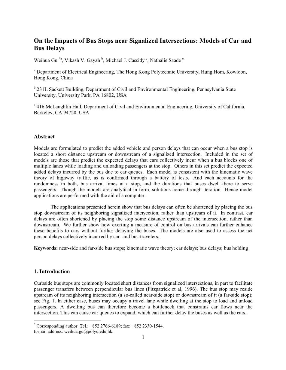 模型是用于预测当一个公交停靠站位于信号交叉口上游或下游短距离范围内可能出现增加的车辆和行人延误。包括哪些预测当一辆公交车在站台进行上下客时阻挡多条车道中的一条车道的情况下车辆共同引发的期望延误。其他在这个集合中预测由于车辆排队引起的增加延误。每个模型是与公路交通的运动波模型是一致的,因为这是通过一系列的测试所证实的。公交到达停靠站的时间与公交停靠在站台服务乘客的持续时间都是具有随机性的。尽管这个模型是在形式上进行分析,但是解决方案是通过迭代进行计算的。因此,模型应用程序是在计算机的基础上进行工作的。