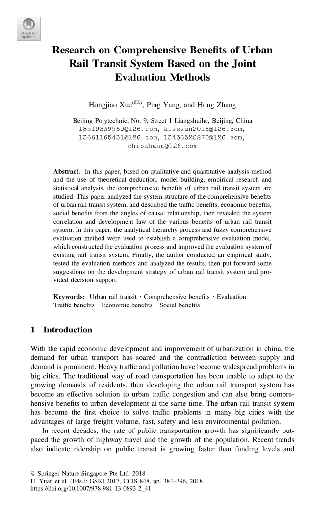 摘要:本文在定性和定量分析方法的基础上,运用理论推导、模型构建、实证研究和统计分析等方法,对城市轨道交通系统的综合效益进行了研究。本文分析了城市轨道交通综合效益的系统结构,从因果关系的角度描述了城市轨道交通系统的交通效益、经济效益、社会效益,揭示了城市轨道交通系统各项效益的系统相关性和发展规律。本文运用层次分析法和模糊综合评价法建立了综合评价模型,构建了评价过程,并对现有轨道交通系统的评价体系进行了改进。最后,作者进行了实证研究,对评价方法进行了检验,并对结果进行了分析,以及对城市轨道交通系统的发展战略提出了一些建议,并提供了决策支持。