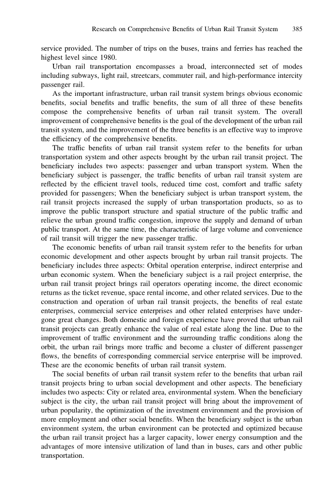 城市轨道交通系统作为重要的基础设施,其带来了明显的经济效益、社会效益和交通效益,这三种效益的总和构成了城市轨道交通系统的综合效益。综合效益的全面提高是城市轨道交通系统发展的目标,提高综合效益的效率是提高综合效益的有效途径。