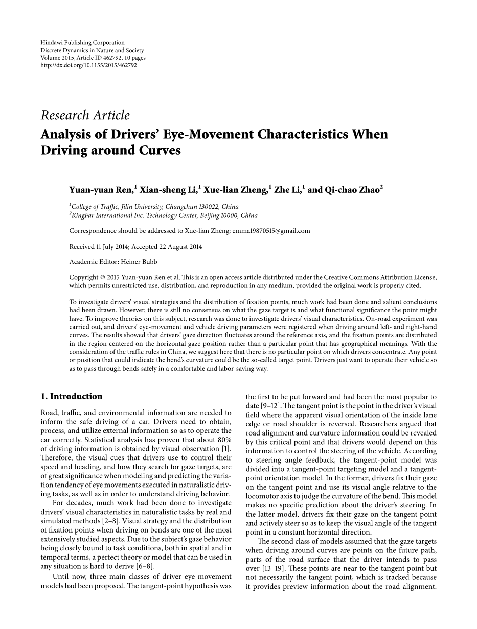 因此,本文继续对驾驶员的眼球运动、注视策略和注视点的分布进行了研究。要求能干的参与者在指定的曲折路线上驾驶实验车,以便收集眼球运动和车辆驾驶参数。对所得数据进行了分析,发现了一些有趣的现象。司机在左转弯和右转弯时,都把目光集中在左边路缘。注视方向围绕参考轴波动,注视点分布在以水平注视点为中心的区域,而不是任何几何点。结合中国的交通规则和这些结果,我们在这里建议,没有驾驶员集中注意力的特定点。可以表明弯曲曲率的任何点或位置都可以是所谓的目标点。司机只是想操纵他们的车辆,以一种舒适和省力的方式安全地通过弯道。