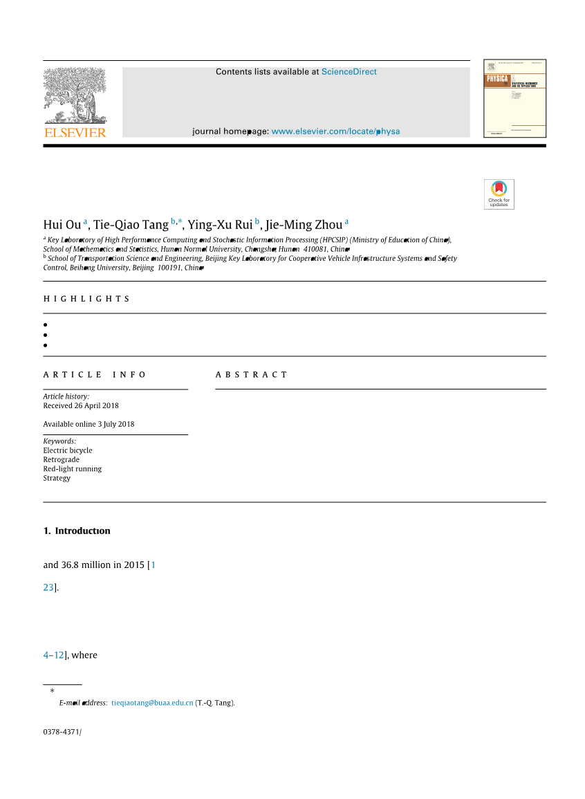 到目前为止,电动自行车(EB)已经在中国普及,2012年和2015年的电子自行车数量分别达到3100万辆和3680万辆[1]。由于电动自行车具有一些突出的优点(例如成本低、体积小等),许多人(尤其是通勤者)已经改变了交通工具。在交通工具方面,15%-24%的人选择了汽车,60%的人选择了公共汽车,7%的人选择了传统自行车。电动车[2];在上海,出现了一些类似的现象[3]。然而,由于电动车的规模非常小,许多混乱的交通行为都会发生。例如,红灯运行和逆行现象普遍存在,产生了许多复杂的交通现象(如拥堵)。因此,电动自行车给交通系统带来了许多挑战(尤其是信号交叉口的运营效率和交通安全)。这些挑战要求研究者去探索电动自行车引起的复杂的交通现象,除了电动自行车的速度比自行车(CB)大之外,电动自行车的运动与自行车的运动相似,这表明自行车流的模型可以用来研究电动自行车流。对于电动车流研究者提议任何模型来描述由自行车流[4–12]引起的复杂交通现象,其中模型大致分为三组。