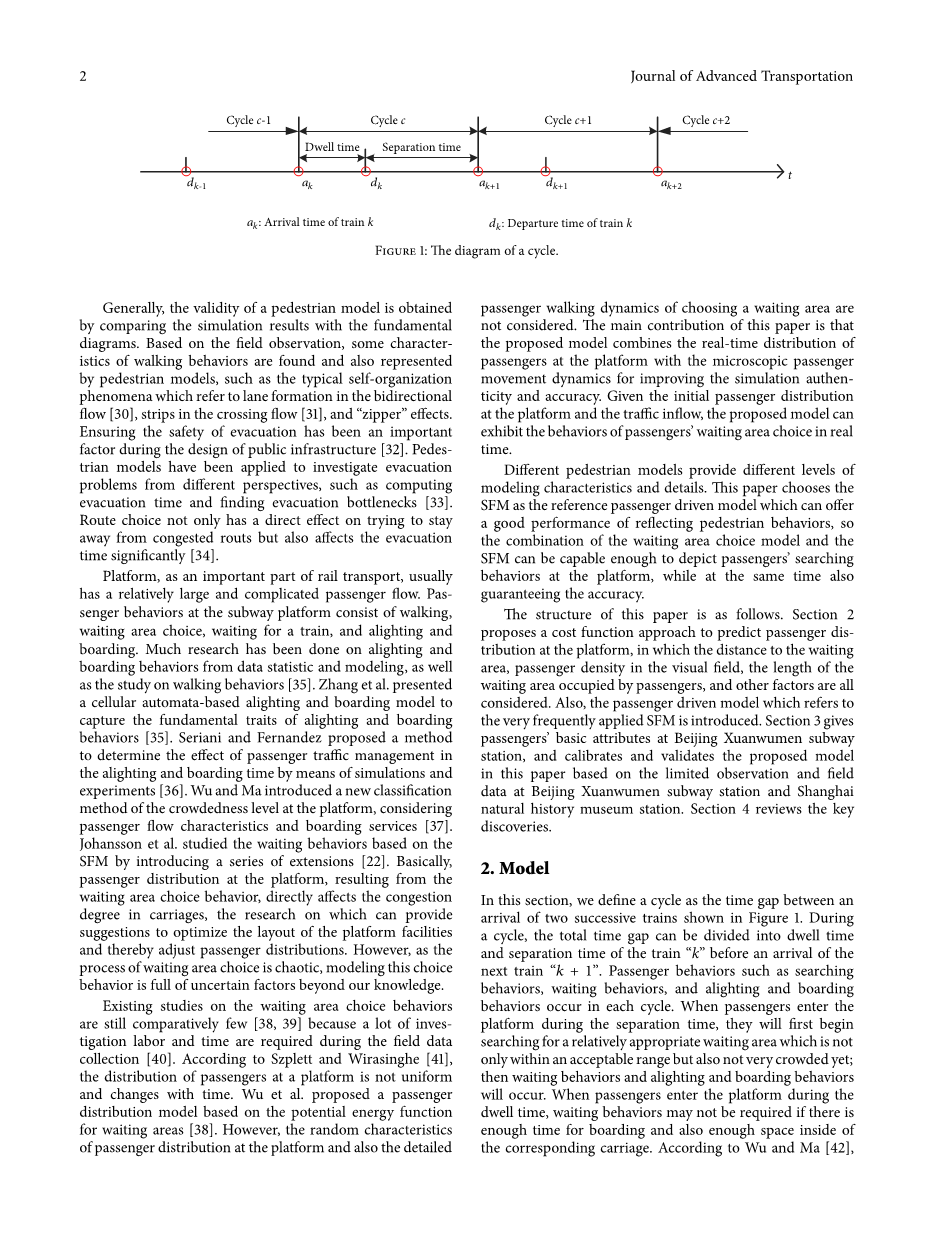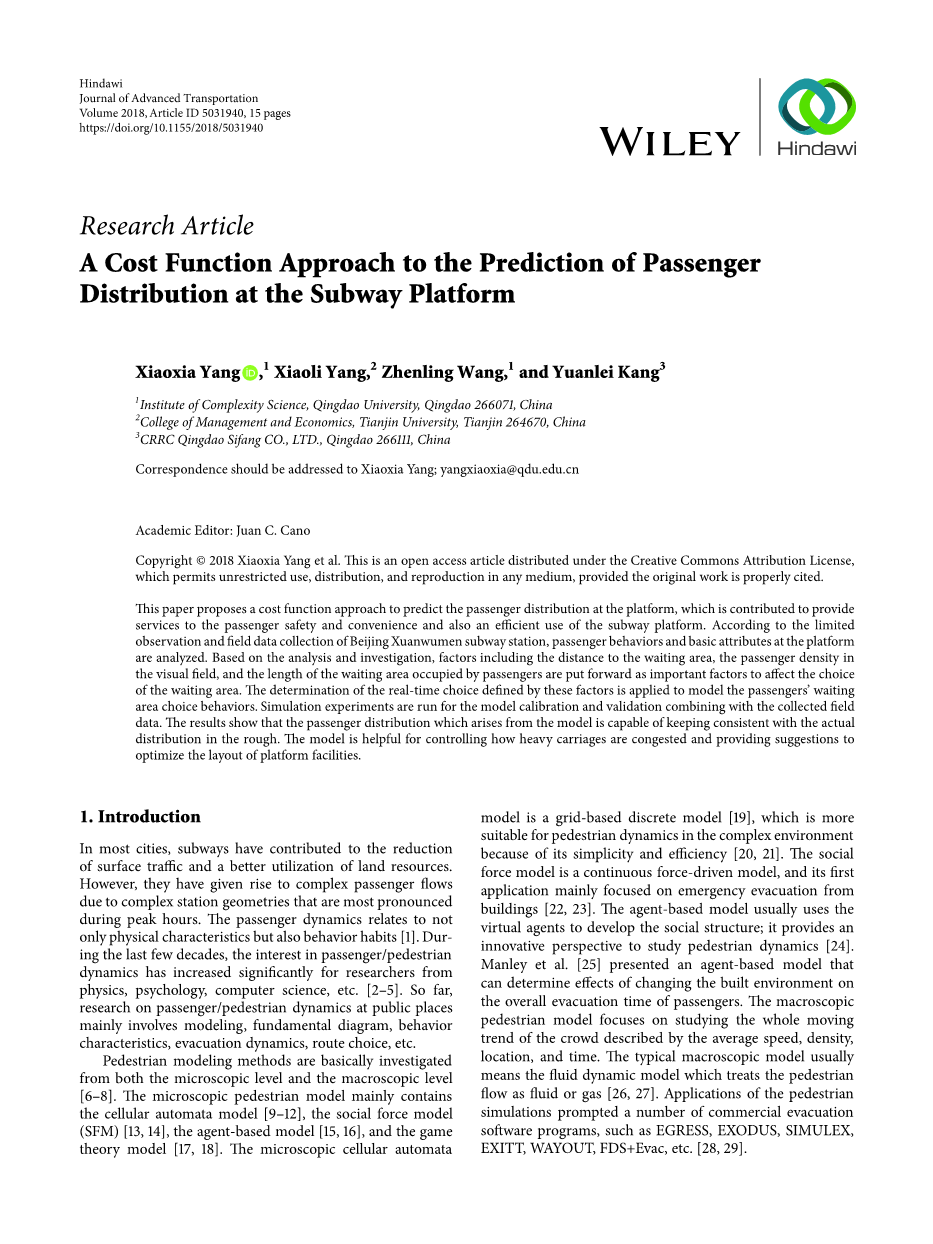 本文的结构如下文所示。第二部分提出了一种基于成本函数的方法以预测乘客在站台中的分布情况。该模型中等候区面积,可视范围中的客流密度,已有排队人数等因素均被考虑在内。与此同时,本部分还介绍了乘客驱动模型中应用较广的SFM。第三部分描述了北京宣武门地铁站的乘客特征。同时,基于由北京宣武门和上海自然博物馆所观测的有限数据,对所提模型进行了验证。