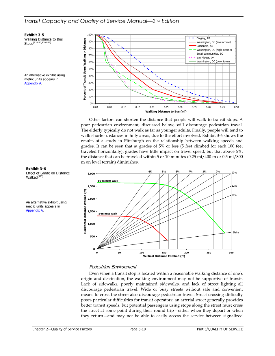 其他因素可以缩短人们步行到过境站的距离。如下文所述,恶劣的行人环境会阻碍行人出行。老年人通常不会像年轻人一样走路。最后,由于所涉及的努力,人们往往在丘陵地区步行较短的距离。图3-6展示了匹兹堡一项关于两国关系的研究结果。步行速度和等级。可以看出,在5%或更低的等级(每100英尺水平爬升5英尺),等级对旅行速度的影响很小,但在5%以上,DIS影响很小。可在5或10分钟内行驶(水平地形为0.25英里/400米或0.5米/800米)的交通流量减少。