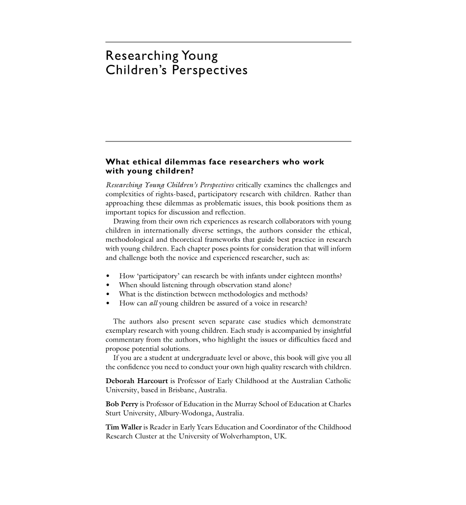 本书《研究幼儿的观点:儿童教育研究的道德与伦理困境》是一个新兴领域非常重要的及时补充。它建立在成员的持续,模范工作的基础上,“幼儿的观点SIG”和其他同事在很多人的时候,与孩子一起研究的人觉得是时候停下来评估他们的工作了,他们的理论和实践框架以及他们的道德立场。