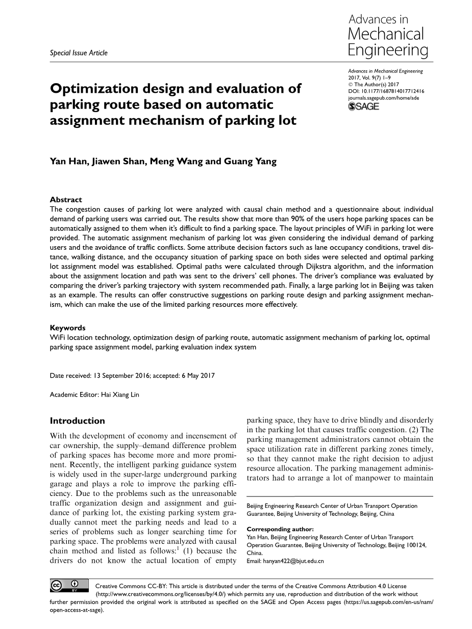 采用因果链方法分析停车场拥堵原因,并对停车场用户的个性化需求进行问卷调查。结果显示,超过90%的用户希望在难以找到停车位时能够自动分配停车位。提供了停车场WiFi的布局原则。考虑到停车用户的个性化需求和避免交通冲突,给出了停车场的自动分配机制。选取车道占用条件,行车距离,步行距离,两侧停车位占用情况等属性决策因子,建立最优停车位分配模型。通过Dijkstra算法计算最佳路径,并将关于分配位置和路径的信息发送给司机的手机。通过比较驾驶员的停车轨迹和系统推荐路径来评估驾驶员的符合性。最后以北京的一个大型停车场为例。研究结果可以为停车设计和停车分配机制提供建设性的建议,可以更有效地利用有限的停车资源