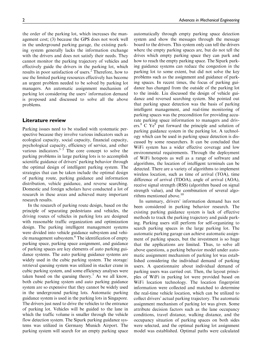 在停车线路设计研究中,根据行人与车辆分离的原则,设计了停车场车辆行驶路线,并进行了合理的交通组织和优化设计。 停车智能管理系统分为车辆引导子系统和车辆管理子系统。空车位识别,停车位分配和停车位引导是汽车停车引导系统的关键要素。 自动泊车引导系统广泛用于立体停车系统。 在立体停车系统堆垛机中采用了存储/检索排队系统,并根据排队理论进行了效率分析。众所周知,立体停车系统和自动停车引导系统都非常昂贵,不能在地下停车场广泛使用。 新加坡的停车场采用了自动泊车引导系统,驾驶员只需将车辆驶入停车场入口即可。 通过车辆流量检测系统将车辆引导至交通量较小的车道。 德国慕尼黑机场采用了Sipark停车引导系统。 停车系统将通过空车位检测系统自动搜索空车位,并通过显示屏向驾驶员显示信息。 这个系统只能告诉驾驶员哪里有空的停车位,但没有告诉驾驶员他们可以停放在哪些空的停车位以及如何到达空的停车位。Sipark停车引导系统可以在一定程度上减少停车场的拥堵,但并未解决停车位分配和引导等关键问题。 近年来,停车场引导的重点已经从停车场外改变为内部。 Liu讨论了车辆导航的设计和逆向搜索系统。 她指出,停车位检测是停车场智能化管理的基础,实时监控停车位是向经营者和司机提供准确停车位信息的前提。C Ye提出停车场停车引导系统的原理和解决方案。 一些研究人员讨论了可用于停车位检测的技术。 可以得出结论:WiFi系统的有效覆盖范围更广,环境要求更低。 通过部署WiFi热点以及一系列软件和算法,可以检测智能终端的位置。 有多种实现无线定位的算法,如到达时间(TOA),到达时间差(TDOA),到达角(AOA),接收信号强度(RSS)(基于信号强度值的算法), 以及上述几种算法的组合。