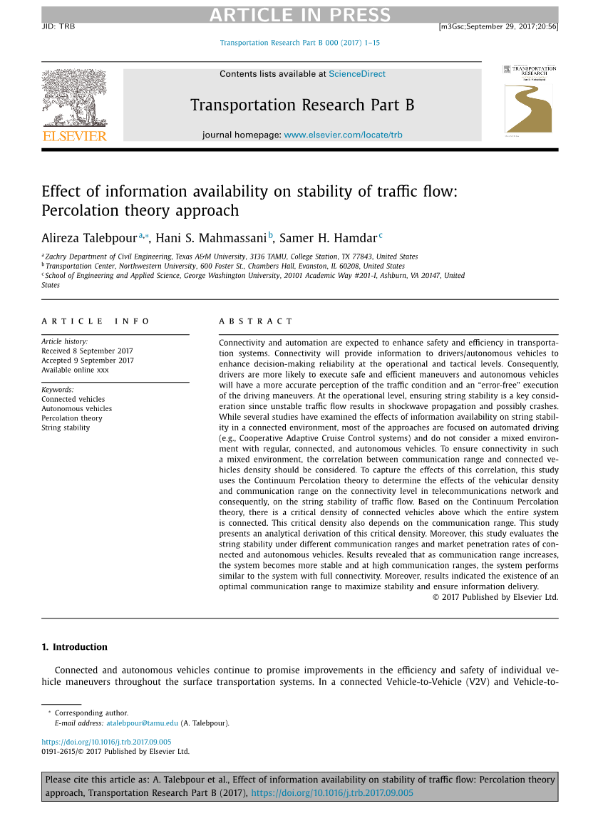 虽然这些和其他研究探讨了通讯对CACC系统中交通流稳定性的影响,并建立了从更大范围研究网联化和自动化对交通流稳定性的影响的基础,但许多问题仍有待解决,包括通讯对常规车、网联车和自动驾驶车队下驾驶员以及交通流稳定性影响。本研究采用渗流理论对信息的可用性进行建模,并评估通信范围和网联车密度对不同网联车和自动驾驶车渗透率下交通流稳定性的影响。