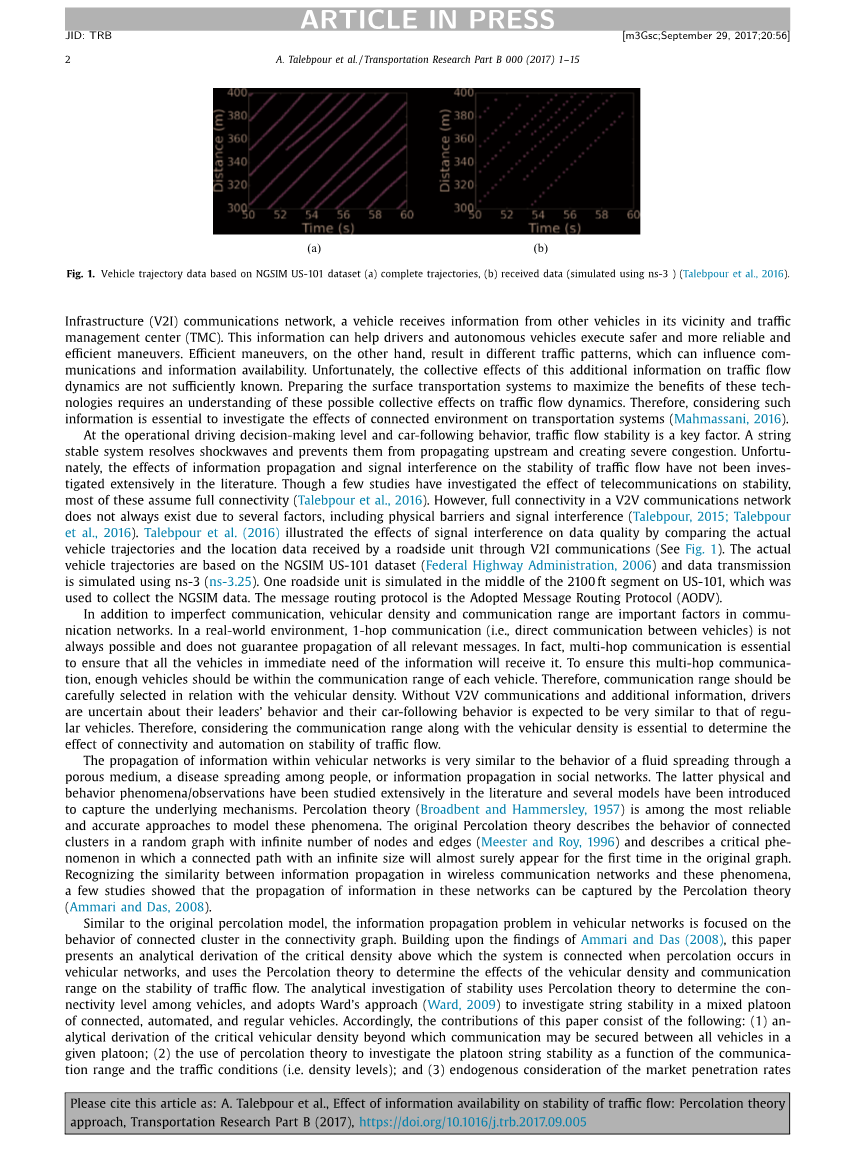 在驾驶决策操作和车辆跟驰行为中,交通流量稳定性是一个关键因素。一个稳定的交通流系统可以解决交通激波,并防止它们向上游传播并产生严重拥塞。然而,信息传播和信号干扰对交通流稳定性的影响尚未得到广泛研究。有一些研究探讨了电信对稳定性的影响,其中大多数都假设在完全网联情况之下(Talebpour et al.,2016)。然而,V2V通信网络下的全网联化并不总是存在,这是由多种因素造成的,包括物理障碍和信号干扰(Talebpour,2015;Talebpour et al.,2016)。Talebpour等通过比较实车轨迹和路侧单元通过V2I通信(如图1)接收到的位置数据,解释了信号干扰对数据质量的影响。实车轨迹基于NGSIM US-101数据集,数据传输使用ns-3进行模拟。在US-101的2100英尺段中,设置一个路侧单元,该单元用于收集NGSIM数据,消息路由协议是采用AODV。