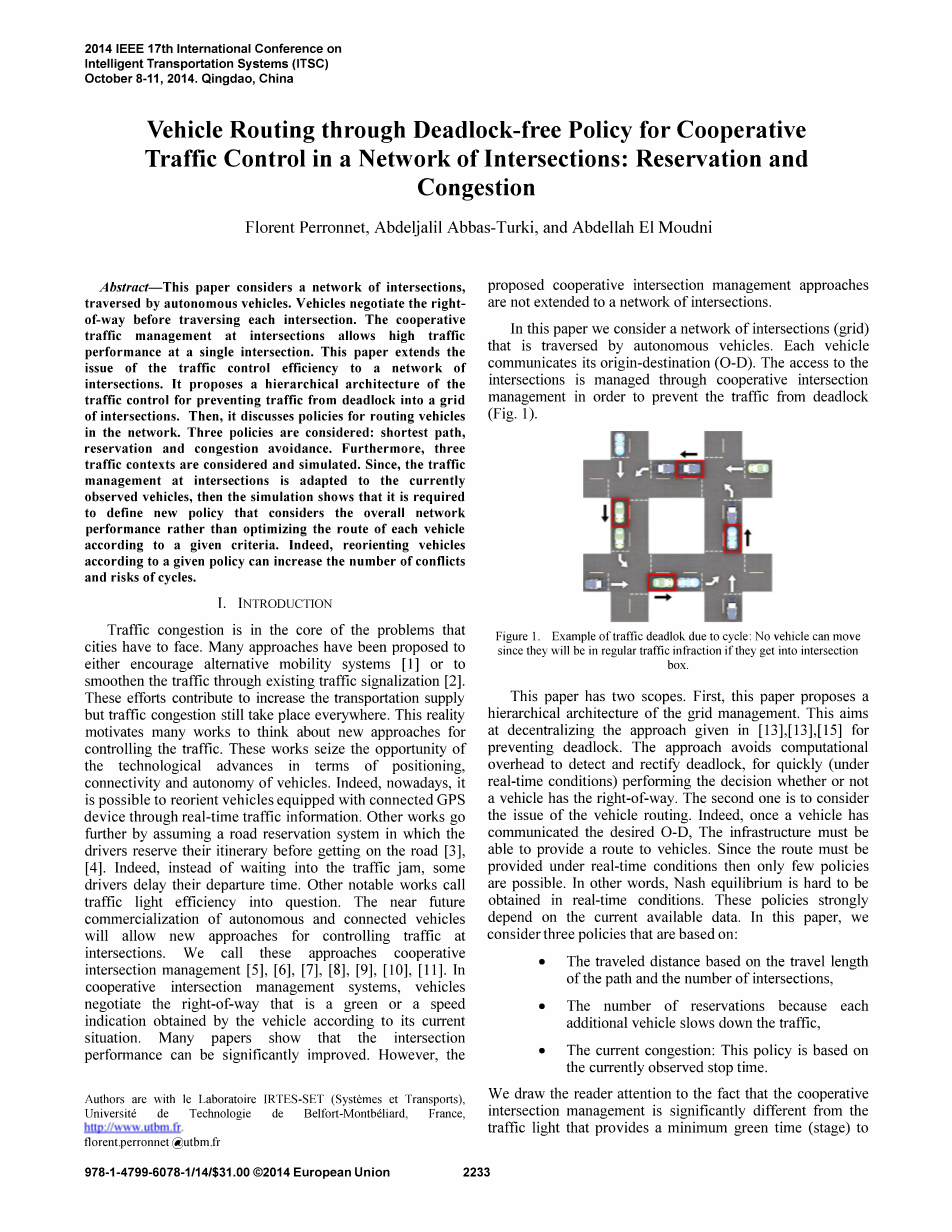 本文有两个范围。首先,本文提出了一种网格管理的分层体系结构,这旨在使用[13],[14],[15]中给出的防止僵局的分散方法。该方法避免了检测和纠正死锁的计算开销,以便快速(在实时条件下)执行关于车辆是否拥有正确路线的决定。第二个是考虑车辆路线问题。事实上,一旦车辆已经传达了所需的O-D,基础设施必须能够提供到车辆的路线。由于路线必须在实时条件下提供,因此只有少数策略是可能的。换句话说,纳什均衡很难在实时条件下获得。 这些政策强烈依赖于当前可用的数据。在本文中,我们考虑三个基于以下内容的政策: