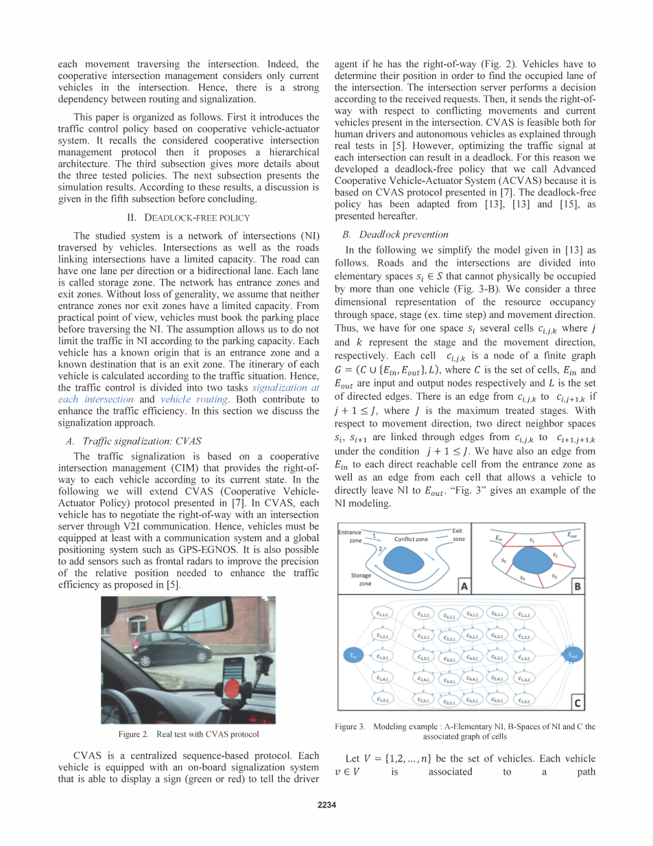 本文组织如下。 首先介绍了基于协同车辆执行器系统的交通控制策略。 它回顾了所考虑的协作交叉管理协议,然后提出了一种分层体系结构。 第三小节给出了三个测试策略的更多细节。 下一小节介绍模拟结果。 根据这些结果,在第五小节结束前进行讨论。