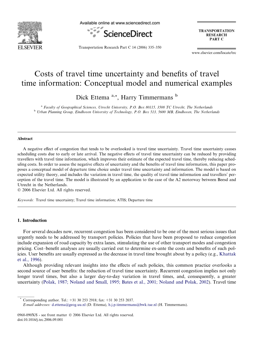 在本文中,一个出行者选择出行时间不确定性和出行时间的概念模型其相关成本得到了发展。 该模型能够区分真实的出行时间分布和出行者对出行时间的感知错误。 这个模型被扩展来描述广义的减少ATIS技术带来的成本(通过降低不确定性)。 在这方面,准确性出行时间信息和感知精度包含在模型中。 该模型已应用评估许多ATIS情景下的交通信息(由个人用户)获得的用户收益现已用于荷兰A2高速公路的具体设置。