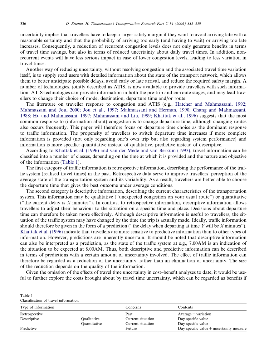 第二类是描述性信息,描述了交通运输的当前特征系统。这些信息可能是定性的(“通常的路线上出乎意料的拥堵”)或定量的(“目前的延迟是X分钟”)。与回顾性信息相比,描述性信息允许出行者在特定的时间和地点调整他们的行为以适应情况。关于出发的决定因此可以更有效地采取时间。虽然描述性信息对旅客有用,但这样的的交通系统可能在旅程实际完成时已经改变。理想情况下,交通信息会因此以预测的形式给出(“在Y时间离开时延迟为X分钟”)。Khattak等人(1996)指出出行者对预测信息比对其他类型的更加敏感信息。但是,预测本质上是不确定的。应该指出的是描述性信息也可以被解释为预测,因为在例如7.00AM处的交通系统的状态是指示情况预计在上午8点。因此,可以描述描述性和预测性信息,在涉及一定数量不确定性的预测方面。交通信息的影响可以被视为减少不确定性,而不是消除不确定性,数值的减少量取决于信息的质量。