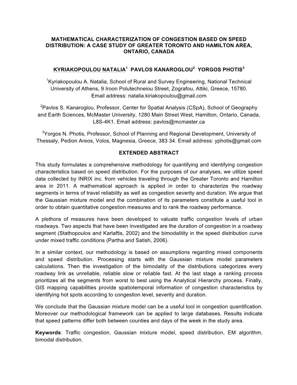 在城市地区众所周知交通拥挤可以增加机动车的排放量. 从而引起空气质量恶化导致的健康,环境,经济问题(Smit et al., 2008). 缓解拥堵的政策的全面选择应包括对拥堵特性的正确理解. 这个特性在每一周的每一天以及每一天的每一刻都变化的非常显著. 拥堵的空间也不均匀的, 在运输网络路段之间有着显著的变化. 这篇文章推荐了一个使用车辆速度数据的数学方法利用高斯混合模型以识别和量化拥堵特性. 在大多伦多和汉密尔顿地区,安大略,加拿大运输层上使用的速度数据展示了这个方法的有效性.