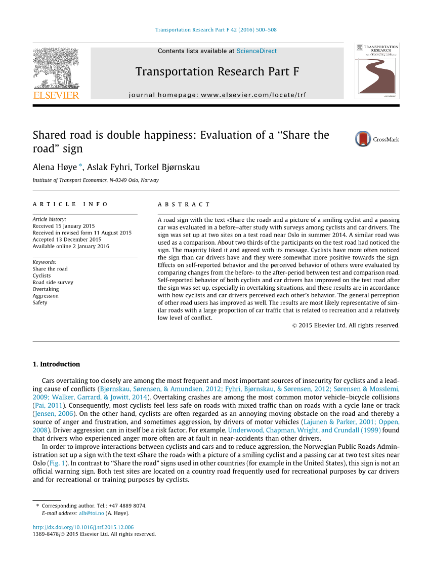 1.A road sign with the text laquo;Share the roadraquo; and a picture of a smiling cyclist and a passing car was evaluated in a before–after study with surveys among cyclists and car drivers.