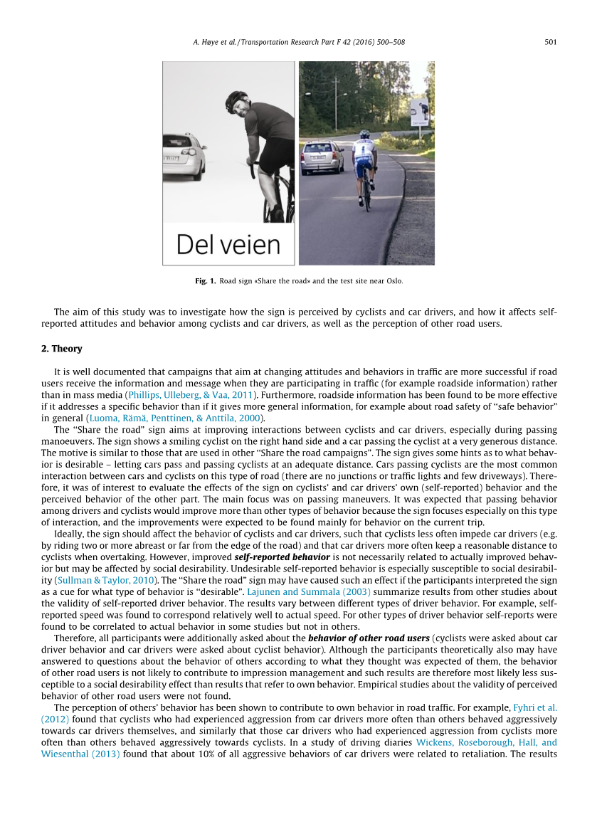 (2)The aim of this study was to investigate how the sign is perceived by cyclists and car drivers, and how it affects self-reported attitudes and behavior among cyclists and car drivers, as well as the perception of other road users.