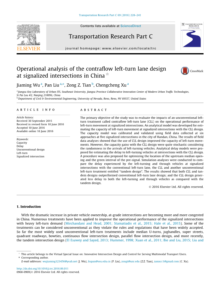 随着私家车拥有量的大幅增加,中国的交叉路口正变得越来越拥挤。已经应用了许多处理措施来改善左转需求较大的信号交叉口的运行性能(Mirchandani和head,2001;Stamatiadis等,2015;hale等,2015)一些处理可以被认为是非常规的,因为它们违反了已被广泛接受的规则和法规。道目前为止,最广泛使用的非常规左转处理包括中位U形转弯,悬挂手柄,超级街道,象限道路,领结,连续流交叉口设计,平行流交叉口设计,以及最近的串联交叉口设计(EI Esawey 和Sayed,2013;Hummer,1998;Xuan等,2011;Bie和Liu,2015;Liu和Bie,2015;Rodegerdts等,2004;Goldblatt等,1994;Krause等,2015;Zhao等,2015)。这些非常规左转弯处理中的大部分都需要左转车辆的重新布线,这可能部分抵消了可以实现的好处(Xuan等,2011)。