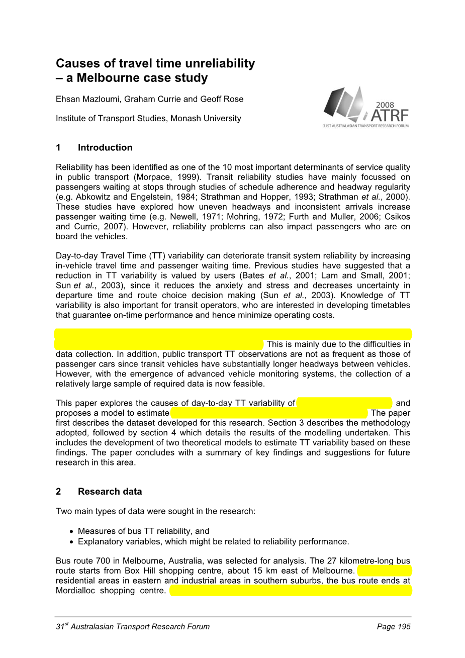 常规公交微观区间运行时间可靠性分析外文翻译资料 2022-03-26 19:14:03 英语原文共 8 页,剩余内容已隐藏,支付完成后下载完整资料 资料编号:[469985],资料为PDF文档或Word文档,PDF文档可免费转换为Word 原文和译文剩余内容已隐藏,您需要先支付 30元 才能查看原文和译文全部内容!立即支付 发小红书推广免费获取该资料资格。点击链接进入获取推广文案即可: Ai一键组稿 | 降AI率 | 降重复率 | 论文一键排版 PREVIOUS NEXT 您可能感兴趣的文章 基于仿真的动态交通分配模型的应用外文翻译资料 微观交通仿真外文翻译资料 在交通分析中的模拟方法外文翻译资料 基于大数据和深度学习方法的极端交通条件下的大 规模全覆盖交通速度估算一中 国案例研究外文翻译资料 车辆一轨道系统垂向相互作用的详细模型外文翻译资料 行人通过狭窄的门道:个体行为对全球流动和微观 动力学的影响外文翻译资料 桥梁工程超高性能混凝土的国际展望外文翻译资料 强台风下大跨度桥斜拉桥的变形监测与分析外文翻译资料 隧道内铁路交通对建筑物振动的影响:数值研究外文翻译资料 利用三维时域有限元分析模拟铁路引起的地面振动外文翻译资料