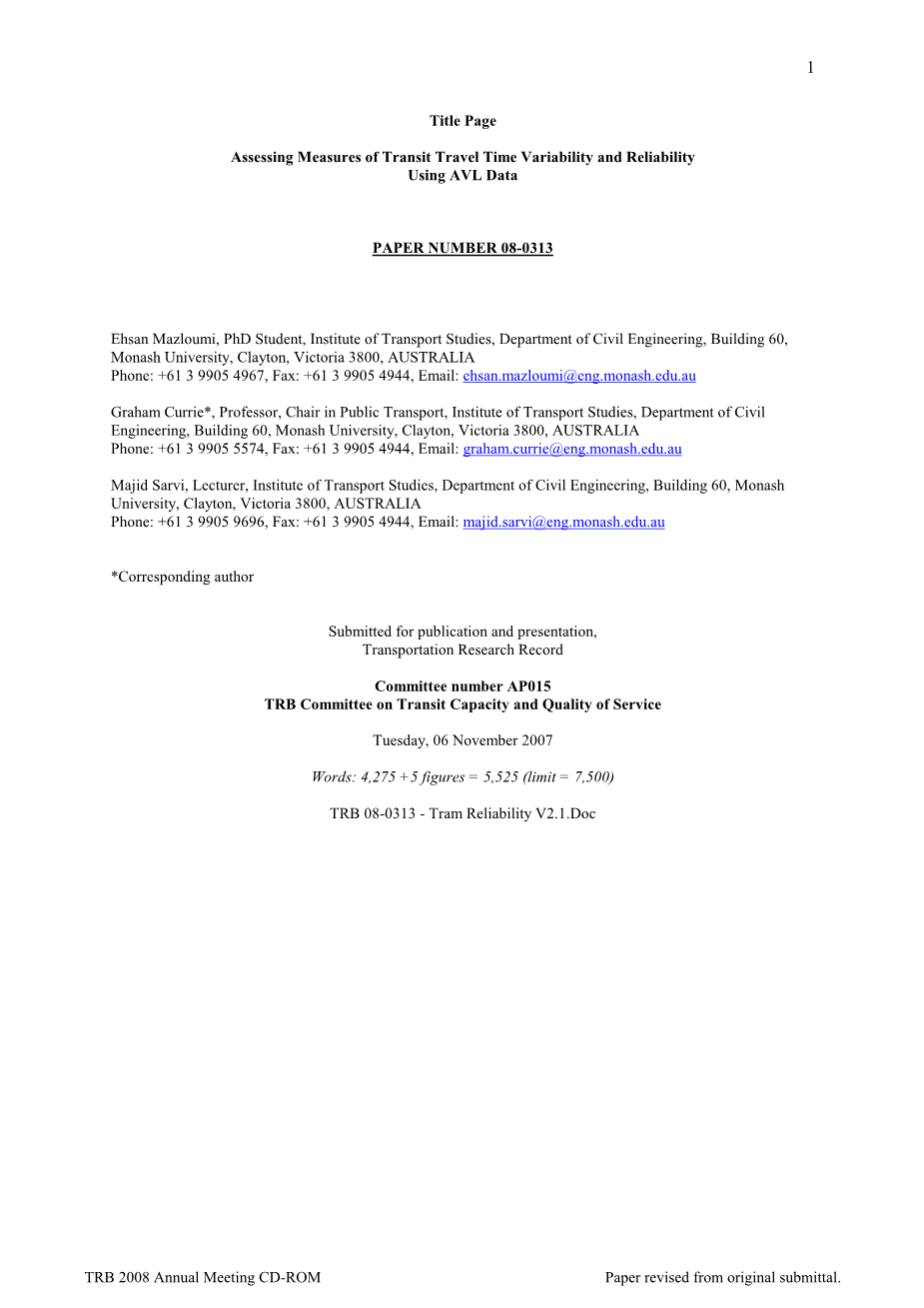 Graham Currie *,澳大利亚维多利亚州维多利亚州Clayton市莫纳什大学60楼土木工程系交通运输研究所公共交通学院公共交通学院教授*电话: 61 3 9905 5574,传真: 61 3 9905 4944,电子邮件 :graham.currie@eng.monash.edu.au