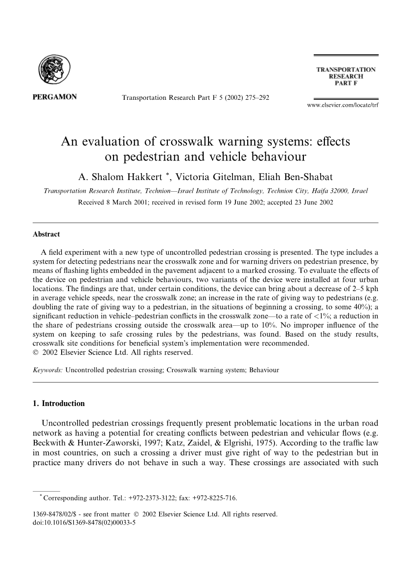 本文介绍了一种新型无控人行横道的现场实验。这种人行横道包括一个系统,该系统用于检测人行横道区域附近的行人,并通过标志性交叉口附近的嵌入路面式闪光灯警告司机行人的存在。为了评估该设备对行人和车辆行为的影响,将该设备的两种变型安装在四个城市地点。研究结果表明,在某些条件下,该装置在人行横道区附近可以使平均车速降低2-5 kph;提高礼让行人的比率(例如,在开始过境的情况下,礼让行人的比率翻倍,达到约40%);人行横道区的车辆 - 行人冲突显著减少至1%;穿越人行横道区域外的行人比例减少达10%。没有发现该系统对行人安全穿越规则存在不当影响。根据研究结果,建议实施有利系统的人行横道网站条件。