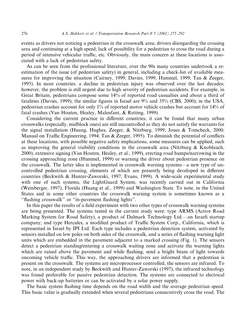 考虑到不同国家的现行做法,可以发现,许多城市的人行横道(特别是中部地区)仍然是无控的,因为它们不满足信号安装的许可条件(Huang,Hughes,Zeeger,&Nitzburg,1999; Jones &Tomcheck,2000; Trac Engineering Manual,1994; Tan&Zeeger,1995)。为了减少在这些地区的潜在冲突以及伴随的对安全的负面影响,可采取一些措施,如改善人行横道上的可视性条件(Nitzburg&Knoblauch,2000),增设指示牌(Van Houten,Healey等 1999),架设减速丘,压缩进口道(Hummel,1999)或警告司机人行横道上有行人。后一种观念被应用于人行横道警告系统中,这是一种新型的无控人行横道,目前各国均有所发展(Beckwith&Hunter-Zaworski,1997; Evans,1999)。最近在加利福尼亚州(温伯格,1997年),佛罗里达州(黄等人,1999年)和华盛顿州进行了一项采用LightGuard系统的大规模实验研究。需要注意的是,在美国和其他一些国家,人行横道警示系统有时被称为“闪光人行横道”或“路面闪光灯”。