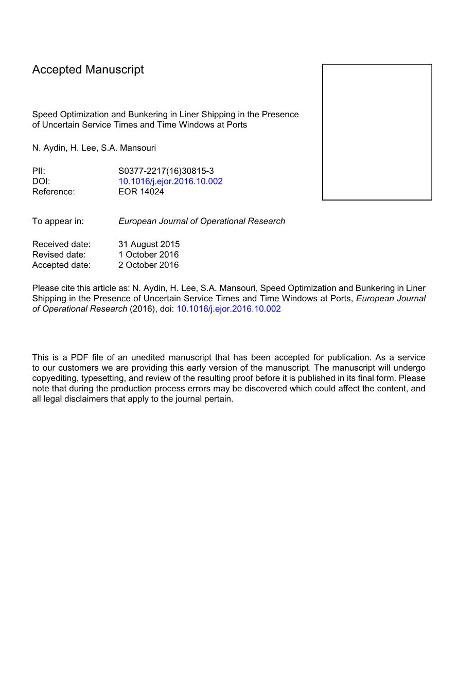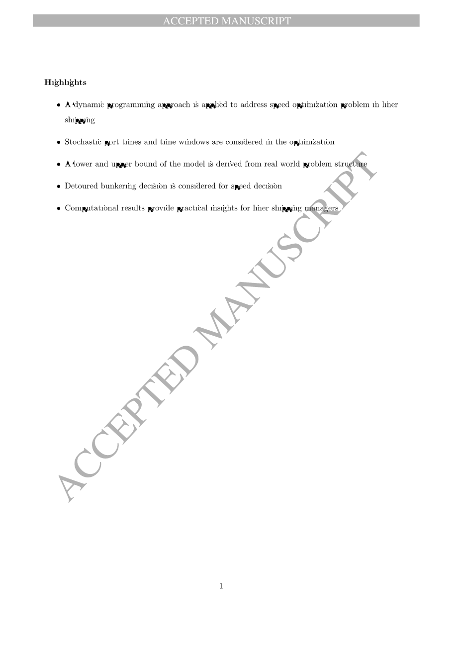 在本文中,不确定的港口服务时间的存在下,我们首先关注速度优化问题。就我们所知,考虑到港口时间不确定性和固定班轮运输路线的港口时间窗口的速度优化问题在文献中尚未得到解决。我们的研究与齐和宋(2012)的工作密切相关。我们考虑定期重复的班轮时间表(每周,每月等),不同于Qi和Song(2012),我们的研究集中在单次航行中带时间窗口的速度优化问题。这使我们能够分析动态模型的结构并研究最佳速度决策的属性。此外,我们使用确定性近似来获得最优期望成本的下限,对于为每个问题实例分配最优性缺口的可能界限是有用的。由于航行速度是由燃料价格决定的,因此我们也研究了航行速度和燃料加注之