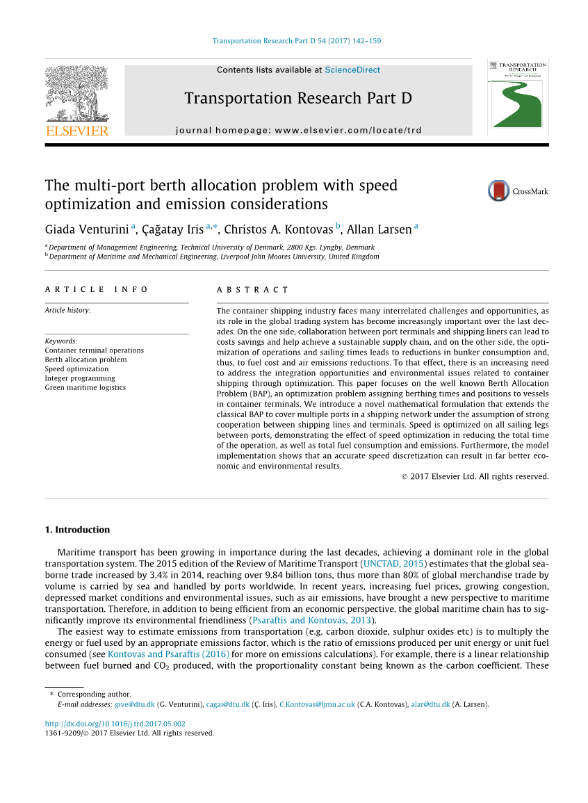 在过去的几十年中,航运一直在增长,在全球运输系统中占据主导地位。2015年的“海运述评”(UNCTAD,2015)估计,2014年全球海运贸易量增长3.4%,达到98.4亿吨以上,因此全球超过80%的商品贸易量通过全世界的港口由海上进行运输。近年来,燃油价格上涨,拥堵加剧,市场条件恶化以及空气排放等环境问题为海上运输带来了新的视角。 因此,除了从经济的角度来看是有效的,全球海运链有显著改善其环境友好性(Psaraftis and Kontovas, 2013)。