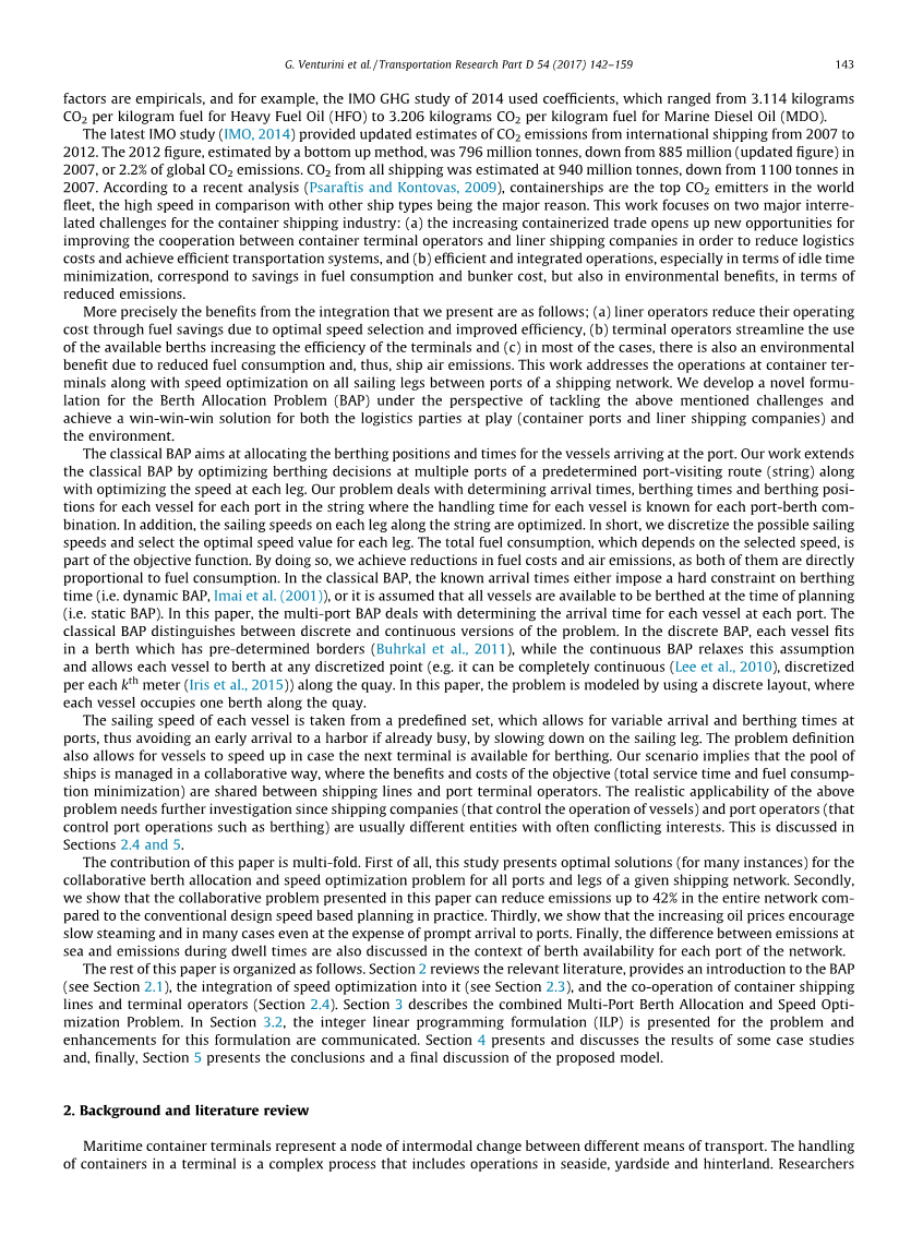 海事组织的最新研究报告(海事组织,2014年)提供了2007年至2012年国际航运二氧化碳排放量的最新估计数据。自下而上法估算的2012年数据为7.96亿吨,低于2007年的8.85亿吨(更新数字),占全球二氧化碳排放量的2.2%。根据最近的一项分析(Psaraftis和Kontovas,2009年),集装箱船是世界船队中二氧化碳排放量最高的,与其他船舶相比其运输速度较快是主要原因。这项工作的重点是集装箱航运业的两个主要挑战:(a)贸易日益集装箱化,为改善集装箱码头运营商和班轮运输公司之间的合作开辟了新的机会,以降低物流成本并实现高效的运输系统(b)高效和一体化的运营,特别是在空闲时间最小化方面,相当于节省燃料消耗和燃料成本,而且在减少排放方面也具有环境效益。