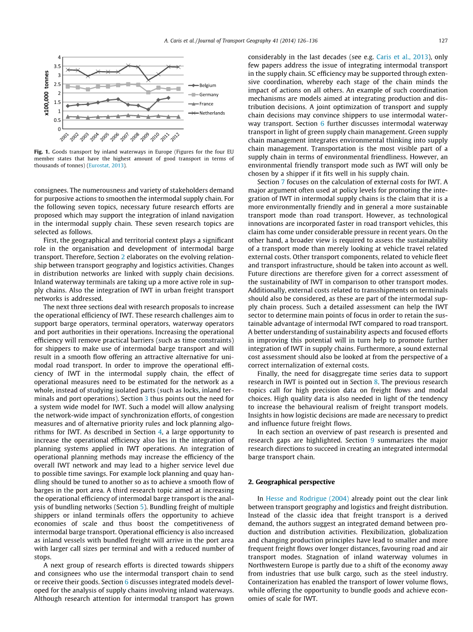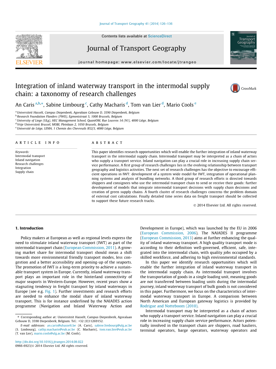 在本文中,我们确定了研究机会,这将有助于内陆水运在联运供应链中的进一步整合。 由于多式联运涉及到在单一装货单元内运输货物,这意味着货物在多式联运过程中不会在装载单元之间转移,本文不考虑内陆水路运输散装货物。 此外,我们关注欧洲的多式联运水路运输的特点。 Rodriguez和Notebook(2010)提供了北美和欧洲门户物流之间的比较。