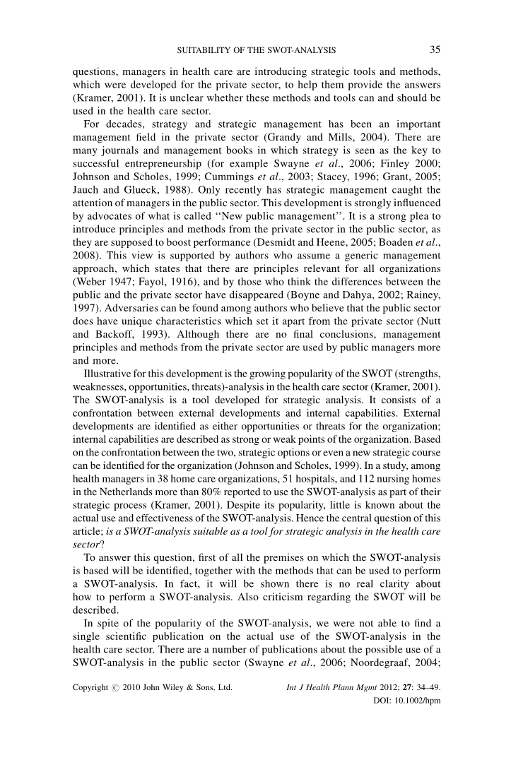 说明这个发展是越来越受欢迎的SWOT(优势、劣势、机会、威胁)分析卫生保健部门(克莱默2001年)。 开发的基础是一个工具进行战略分析。 它包括内部发展和外部之间的对抗能力。 被确定为外部发展机会或威胁的组织; 内部功能被描述为强弱的组织。 基于两者之间的对抗,战略选择,甚至可以确定新的战略课程的组织(约翰逊和斯科尔斯,1999年)。 在一项研究中,在卫生管理人员38家庭护理机构,112年51医院和疗养院在荷兰80%以上报道使用基础作为其战略过程的一部分(克莱默2001年)。 尽管它的受欢迎程度,对实际使用和有效性的基础。 因此,本文的核心问题;是一个基础适合作为战略分析工具在卫生保健领域吗?