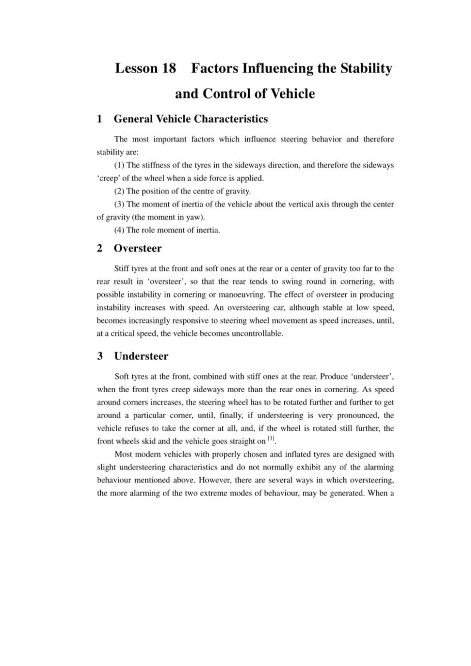 很清楚,虽然改变车辆的载重不大可能增大转向不足特性,然而前轮胎充气不足或者后轴上的子午线轮胎和前轴上的横纹前轮胎配套使用却会使之增大,尽管,转向特性的上述变化更易于察觉而且不太可能像察觉过度转向的增大那么困难。