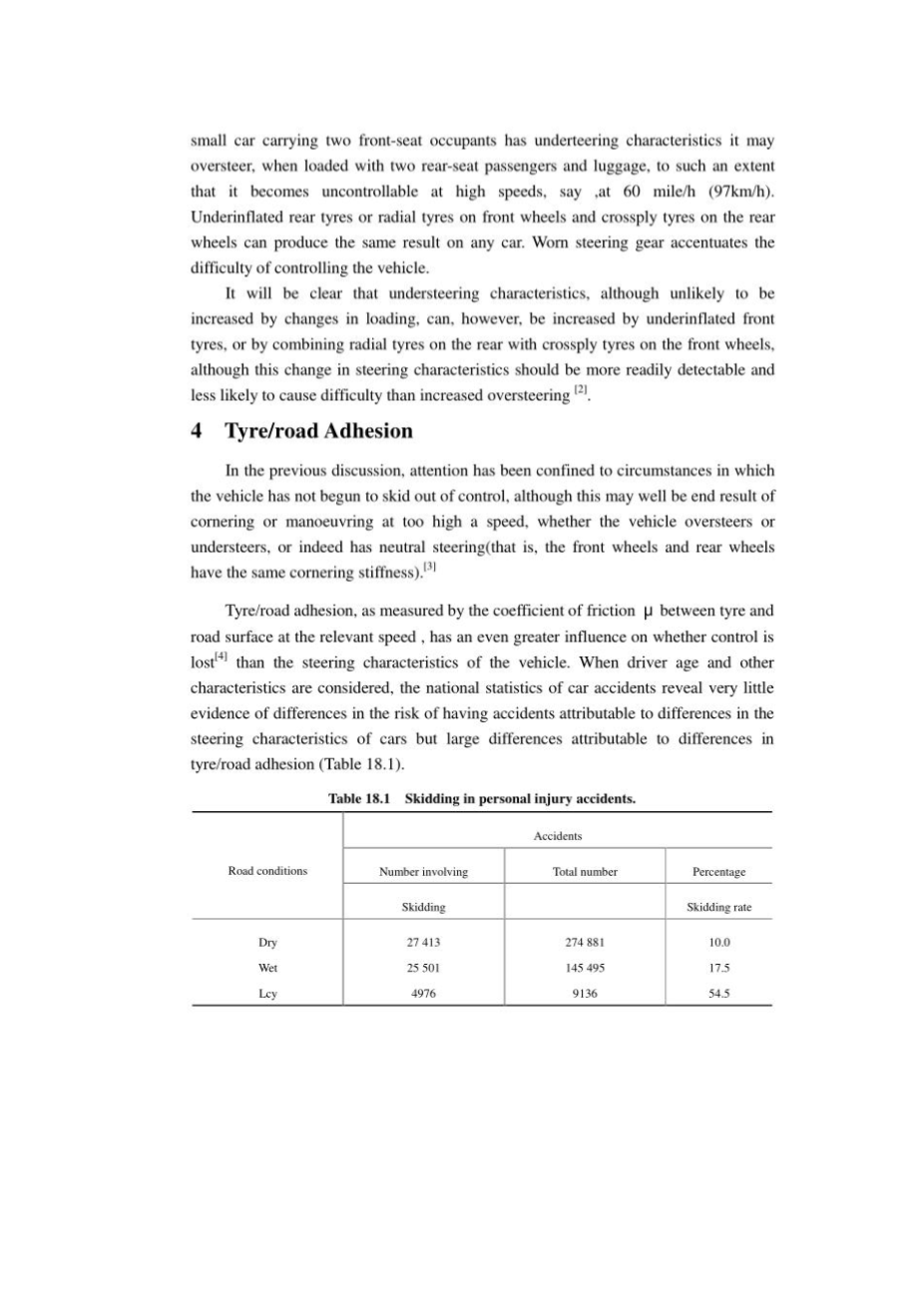 正如在相关车速下,轮胎和道路表面的摩擦系数mu;所评测的那样,轮胎/道路的粘着性比车辆的转向特性,对是否失去控制的影响甚至更大。当考虑了司机的年龄和其它的特性时,全国车祸统计数据显示,很少有证据表明由于汽车转向特性的差异而导致事故风险的差异