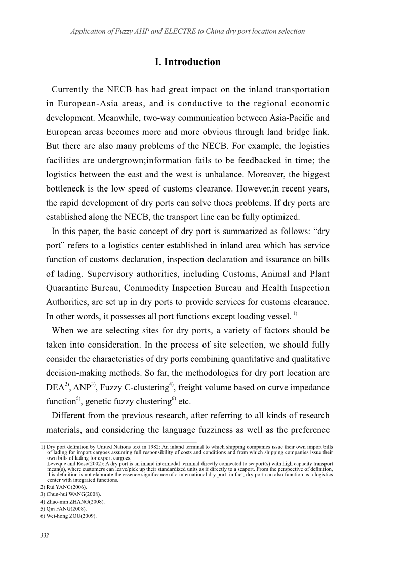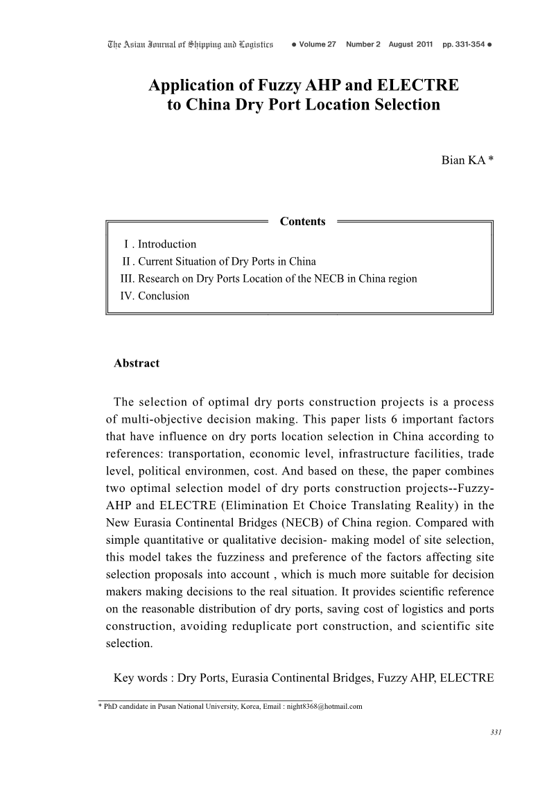 关键词: 干港、欧亚大陆大陆桥、模糊AHP、ELECTRE