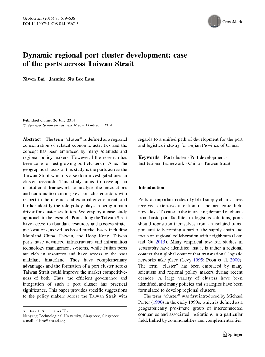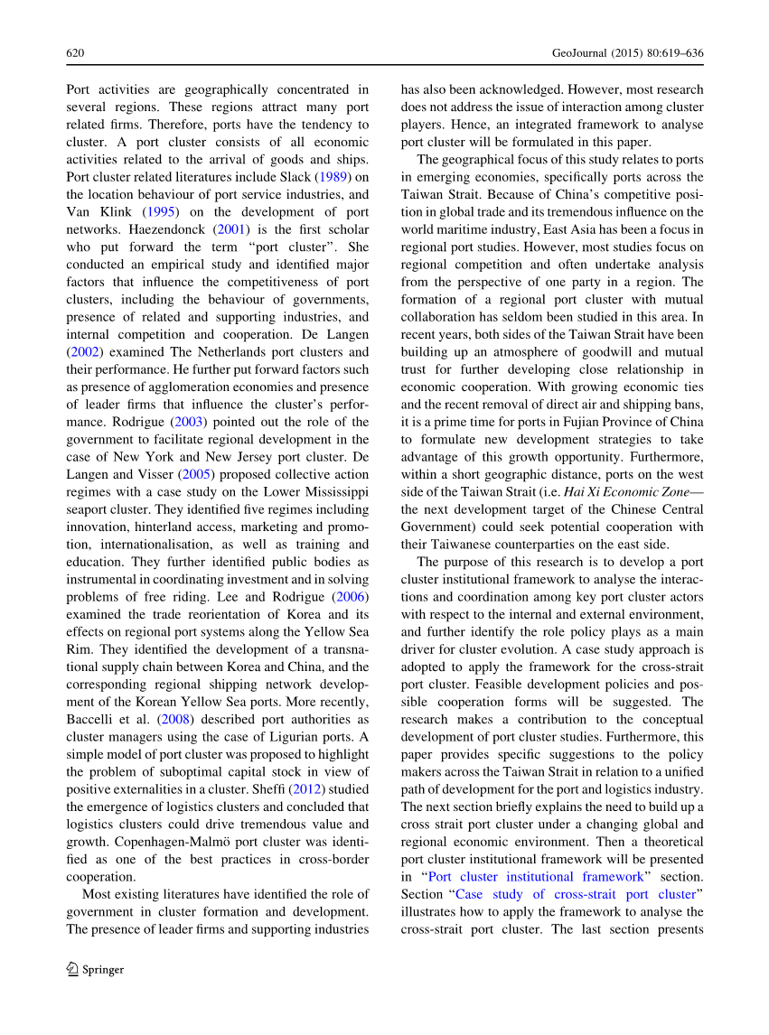 “集群”一词被定义为相关经济活动的区域集中,这一概念已被许多科学家和区域决策者所接受。但是,很少有研究涉及亚洲快速增长的港口集群。这项研究的地理重点是海峡两岸港口,这是一个在集群研究中很少被调查的地区。本研究旨在建立一个制度框架来分析关键港口集群参与者之间在内部和外部环境方面的相互作用和协调,进一步确定政策是集群演化的主要驱动力。我们在研究中采用案例研究方法。海峡两岸拥有丰富的资源和战略位置,以及包括中国大陆,台湾和香港在内的广泛的市场基础。台湾港口拥有先进的基础设施和信息技术管理系统,而福建港口资源丰富,可进入广阔的内地腹地。 它们具有优势互补,海峡两岸港口群的形成可以提高两者的市场竞争力。因此,这种港口群的有效治理和整合具有现实意义。 本文为海峡两岸决策者提供了具体的建议,致力于为中国福建省的港口和物流业开辟统一的发展道路。