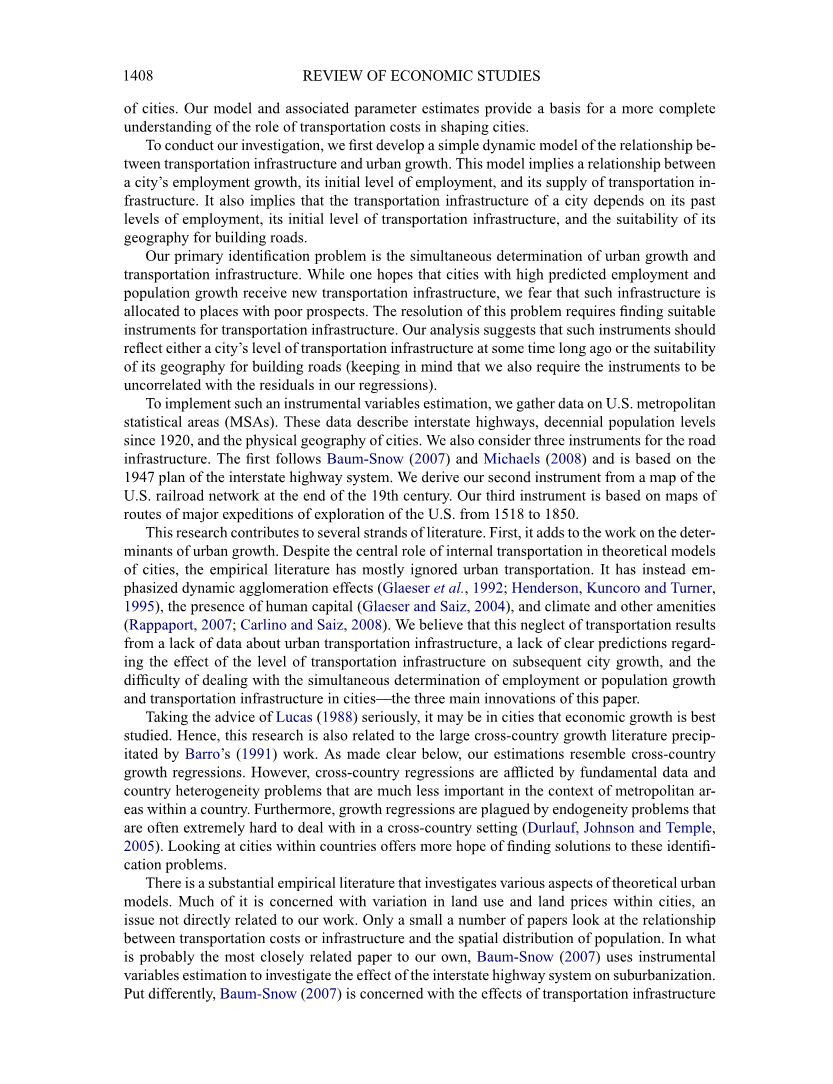 本研究对大量的文献研究有帮助。首先,它增加了城市发展的决定因素。尽管内部交通在城市理论模型中起到了核心作用,但是实证文献大多忽略了城市交通。相反它们强调动态集聚效应(格莱泽等,1992;亨德森等,1995)、人力资本的现状(格莱泽和赛斯,2004)、和气候及其他设施(拉帕波特,2007;卡利诺和赛斯,2008)。我们认为这些研究中忽略了交通,是因为缺乏城市交通基础设施的数据、缺乏关于交通基础设施对随后发展起来的城市的影响水平的准确预测以及难以对城市就业或人口增长和其交通基础设施的同时测定。这三点也就是本文的主要创新点。