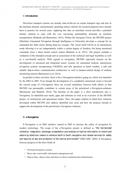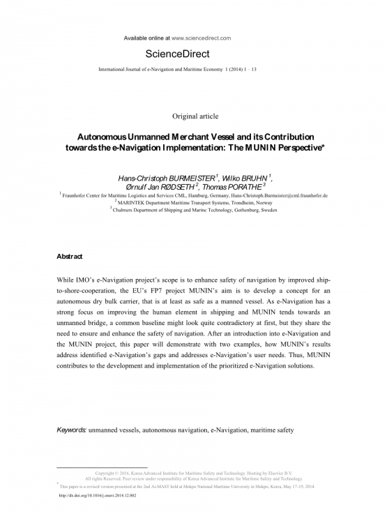 虽然IMO的电子导航项目的范围是通过改进船到岸合作来提高航行安全,但欧盟的FP7项目MUNIN的目标是开发一个概念自主干燥散货船,这至少是和载人一样的安全容器.由于电子导航非常注重改善航运中的人为因素,而MUNIN倾向于无人驾驶桥一般来说,共同的基线可能看起来很矛盾,但它们共同需要确保并增强导航的安全性。在介绍了电子导航和MUNIN项目之后,本文将通过两个例子展示MUNIN的结果如何解决已识别的电子导航的差距并解决电子导航的问题。用户 需要。因此,MUNIN有助于发展和发展履行 优先的电子导航解决方案。