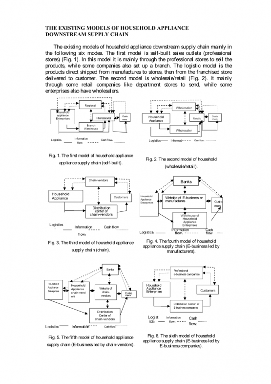 物流是:制造商 - 批发商仓库 - 零售商仓库 - 客户。第三个是链模型(如图3),它主要通过连锁供应商(如国美,苏宁,三联等)进行销售。物流是制造商- 配送中心 - 客户。第四个模型是由制造商主导的电子商务(如图4)。制造商在电子商务网站(如淘宝网)上设置自营门户网站或所开的店铺进行销售。物流由快递派送完成,而现金流可以则通过银行完成。第五种模式是由家电连锁企业主导的电子商务(如图5),公司建立国美在线,苏宁易购等网上商店,而物流和现金流与第三种相同。第六种模式由京东商城等专业电子商务公司主导(图6)。业务流程在线完成,而物流直接从配送中心(主要在中心城市)交付或使用快递给客户。从数量来看,实体店仍然主导着家电下游供应链,而连锁供应商是其中最大的一部分,但是现在线上订购发展迅速,而且辐射力强。以上所有的型号都与一般家电制造企业相同,但是具有不同的比例。