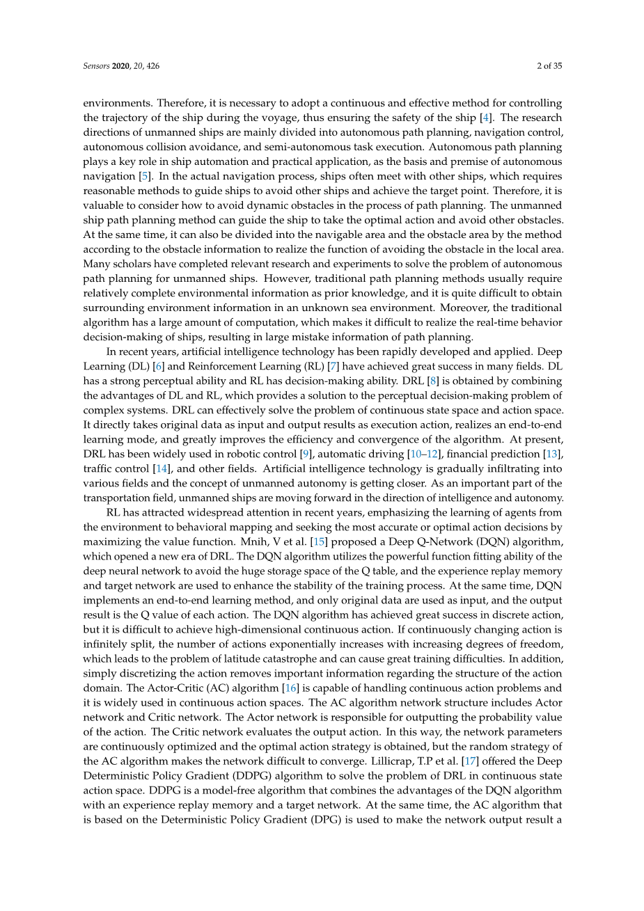 本文其余部分的结构如下。第二部分是对相关工作的回顾。第3节给出了基于DRL的无人驾驶船舶自主路径规划模型。第四部分是仿真实验过程与实验结果的对比分析。最后,第五部分对全文进行总结。