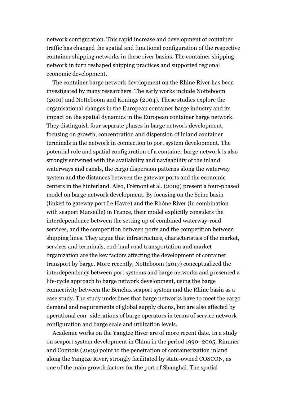 第一,现存文献主要分析两个方面。第一个方面与(内陆)港口系统的发展有关,涉及配置转换,例如通过测量货物浓度或分散模式。第二方面探讨了能够解释河流网络形态变化的因素。在一些研究中,这两个方面结合起来,提出了河流上集装箱驳船网络空间和功能发展的模型(如Notteboom和Konings在2004年的研究;Fremont 等人在2009年的研究; Veenstra和Notteboom在2011年的研究;Wiegmans等人在2015年的研究;Notteboom,在2017年的研究;Yang等人在2017年的研究),这在很大程度上是受到海港系统开发文献中发现的类似模型的启发。