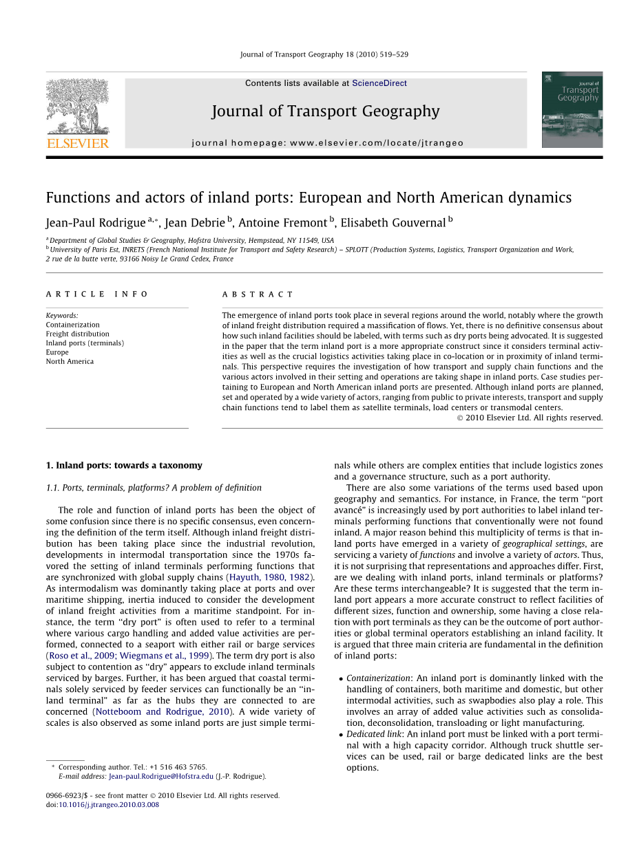 内陆港口的出现发生在世界各地的几个地区,尤其是内陆货运分布的增长需要大量的流量。然而,对于如何给这些内陆设施贴上标签,并没有达成明确的共识,提倡使用陆港等术语。本文认为,内河港口是一个更合适的概念,因为它考虑了码头活动以及在同一地点或靠近内河港口的地方发生的重要物流活动。这一观点要求调查运输和供应链如何运作,以及参与其设置和运作的各种行动者如何在内陆港口形成。本文介绍了欧洲和北美内陆港口的案例研究。尽管内陆港口由从公共利益到私人利益的各种行动者规划、设置和运营,但运输和供应链职能部门倾向于将其标记为零散码头、负荷中心或跨运输中心。