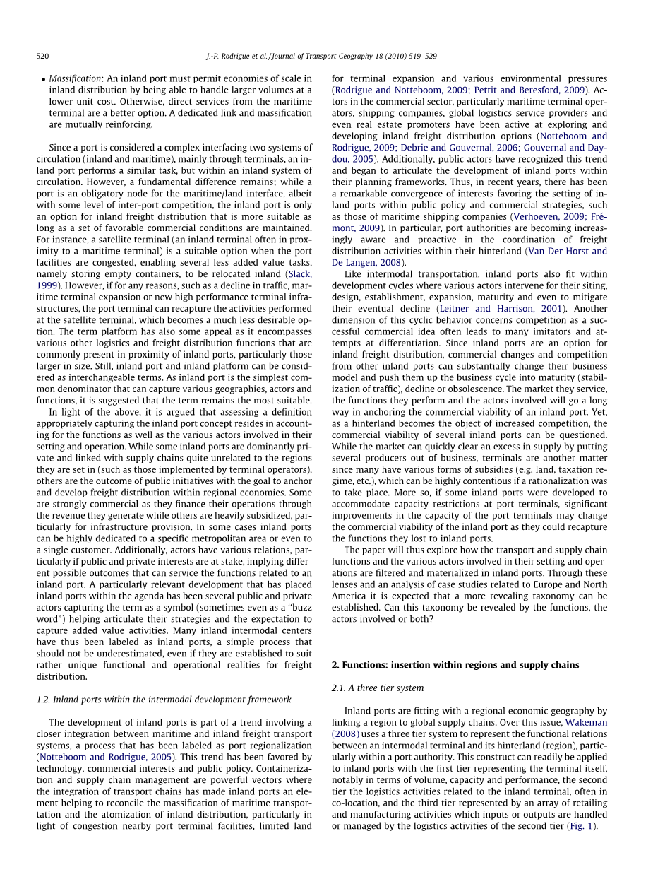 内陆港口的作用和功能一直是一些混乱的对象,因为没有具体的共识,甚至涉及对术语本身的定义。尽管自工业革命以来,内陆货运配送一直在进行,但自20世纪70年代以来,多式联运的发展推动了内陆码头功能的设置,这些功能与全球供应链同步(Hayuth,1980,1982)。由于多式联运主要发生在港口和海上运输,惯性导致从海上的角度考虑内陆货运活动的发展。因此,术语“陆港”通常用于指各种货物装卸和增值活动形成的码头,通过铁路或驳船服务与海港相连(Roso等人,2009年;Wiegmans等人,1999年)。“陆港”一词也有争议,因为“陆港”似乎不包括由驳船服务的内陆码头。此外,有人认为,仅由支线服务提供服务的沿海码头就其所连接的枢纽而言,在功能上可以是“陆上码头”(Notteboom和Rodrigue,2010年)。由于一些内陆港口只是简单的码头,而另一些则是复杂的实体,包括物流区和管理结构,如港务局,因此也观察到了各种规模。