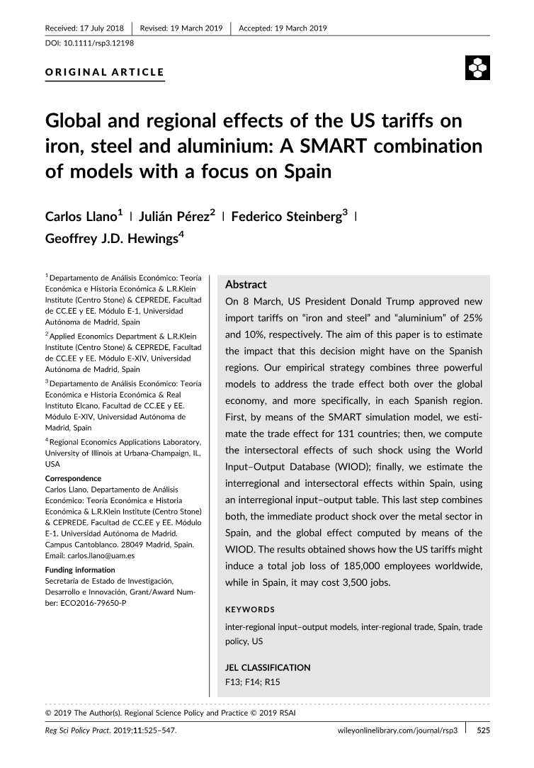 bull;最后,使用一个独特的区域间投入产出表(SIRIO)对西班牙境内的所有先前影响进行了区域化,其结构与WIOD非常相似,但考虑到18个西班牙区域与世界其他地区之间的部门间关系。在这方面,考虑了两种不同的影响:第一,美国关税对西班牙金属行业的直接贸易影响,第一步由SMART模型计算(产品效应);第二,全球效应,当这些影响被WIOD捕获,被量化为美国关税对世界(西班牙除外)的初始影响在西班牙产生的部门-区域影响。