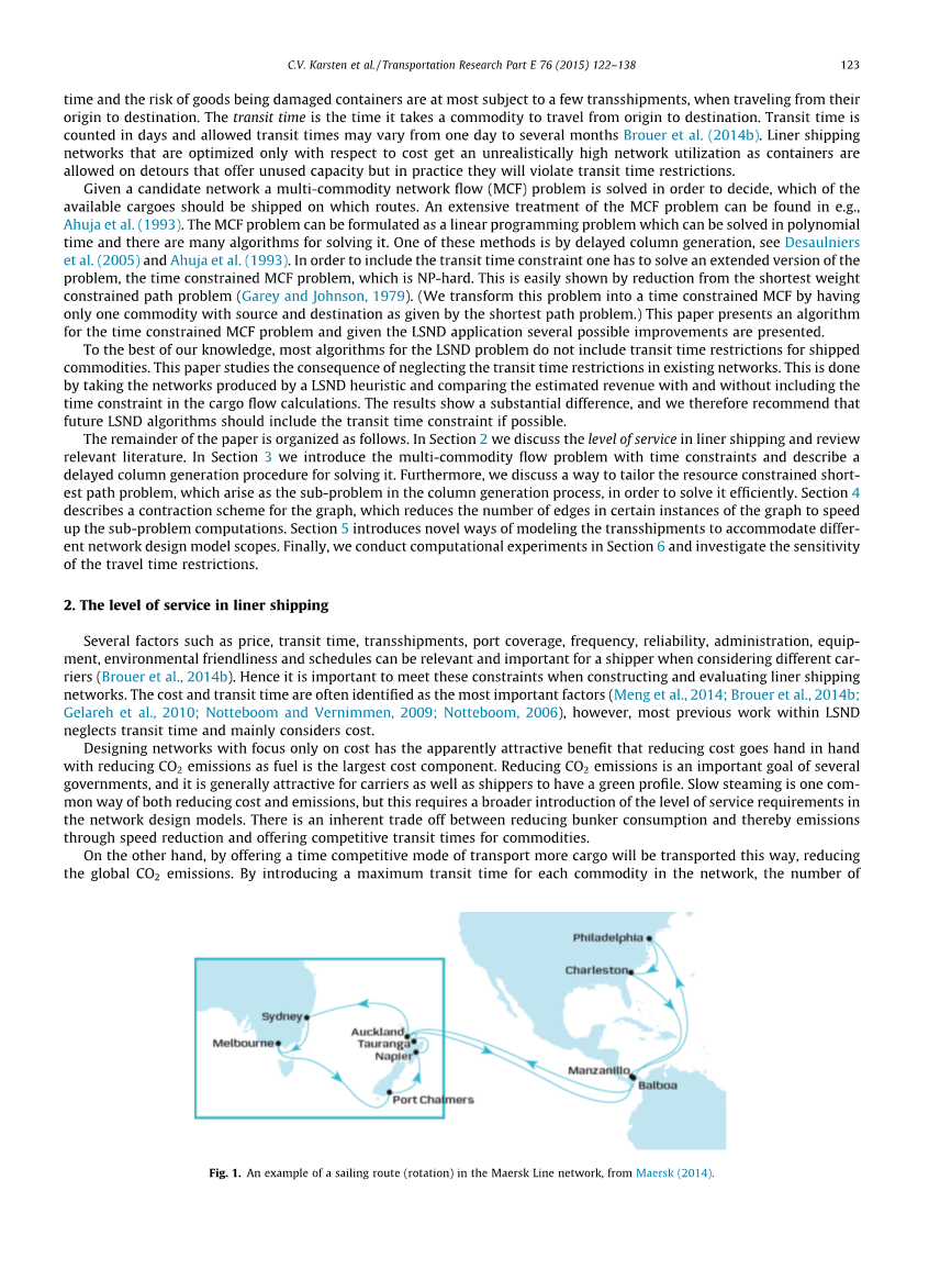 根据IMO(2014年)的数据,全球贸易的90%是通过海洋进行的,悬挂欧盟旗帜的船只排放的二氧化碳超过2000万吨(海洋二氧化碳,2014年)。集装箱运输占世界货物运输的主要份额,并且一直在稳步增长(由于经济危机,2009年前后略有下降)。与其他运输方式相比,国际上对集装箱运输的依赖只会因为其经济优势而增加。此外,海运每吨货物的二氧化碳排放量明显低于公路和铁路运输。因此,即使班轮运输公司基础网络的微小改进,也会在经济和环境方面产生重大影响。尽管如此,班轮运输网络设计(LSND)问题在运筹学文献中并没有得到太多的关注,也远没有得到很好的解决(Meng等人,2014)。Christiansen等人。(2004年和2013年)全面回顾了海运优化和班轮运输领域内发表的文献。
