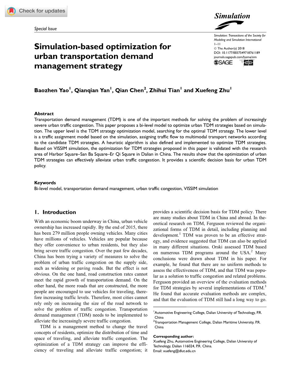 交通需求管理是解决日益严重的城市交通拥堵问题的重要方法之一。本文提出了一个基于模拟的双层模型来优化城市时分复用策略。上层是时分复用策略优化模型,搜索最优时分复用策略。下层是基于模拟的交通分配模型,根据候选的时分复用策略将交通流分配给多式联运网络。还定义并实现了一种启发式算法来优化时分复用策略。基于VISSIM仿真,以大连港广场-三巴广场-二七广场为研究区域,对本文提出的时分复用策略进行了优化验证。结果表明,城市时分复用策略的优化能够有效缓解城市交通拥堵。为城市交通发展管理政策提供了科学的决策依据。