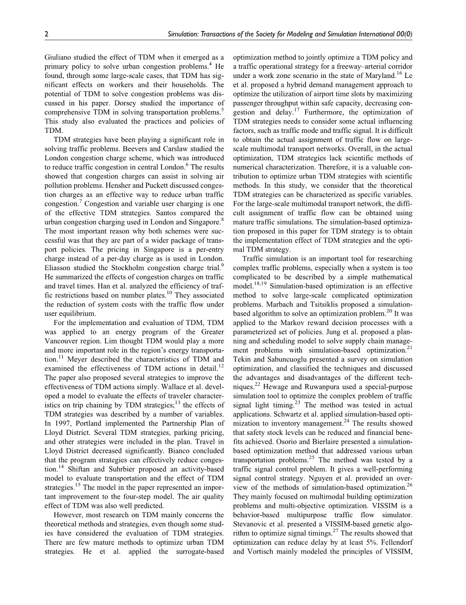 然而,尽管一些研究已经考虑了对分时度假策略的评价,但大多数对分时度假的研究主要集中在理论方法和策略上。很少有成熟的方法来优化城市时分复用策略。何等人应用了基于代理的一种优化方法,用于在马里兰州的工作区场景下,联合优化高速公路-干线走廊的时分复用策略和交通运行策略。Le等人提出了一种混合需求管理方法,通过在安全容量内最大化旅客吞吐量,减少拥挤和延误,来优化机场时隙的利用。此外,时分复用策略的优化需要考虑一些实际的影响因素,如交通模式和交通信号。在大规模多式联运网络中,很难获得实际的交通流分配。总体而言,在实际优化中,时分复用策略缺乏科学的数值表征方法。因此,用科学的方法优化城市交通发展战略是一个有价值的贡献。在本研究中,我们认为理论上的分时度假策略可以被描述为特定的变量。对于大规模多式联运网络,交通流的困难分配可以使用成熟的交通模拟来获得。本文提出的时分复用策略的仿真优化是为了获得时分复用策略的实施效果和最优时分复用策略。