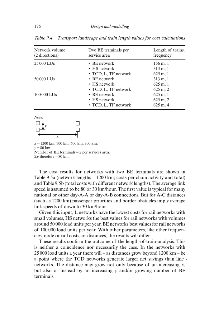 具有两个BE终端的网络的成本结果如表9.5a所示(网络长度1200公里;每个链活动的成本和总成本)和表9.5b(不同网络长度的总成本)。假设平均链路速度为80或30公里/小时。第一个值是许多国家或其他日-A-A或日-A-B连接的典型值。但对于空调距离(如1200公里),乘客优先和边界障碍意味着平均链接速度下降到30公里/小时。