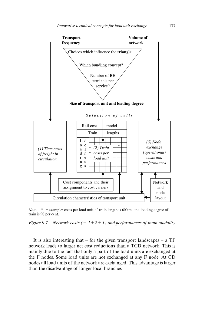 以及这种方法的简化版本(图9.8的右侧)。在这两种情况下,规模经济的核心因素是路线或网络的运输量,而不是捆绑三角形方法中的车辆规模。证据或(路线或网络)运输量相关的成本函数不清楚。